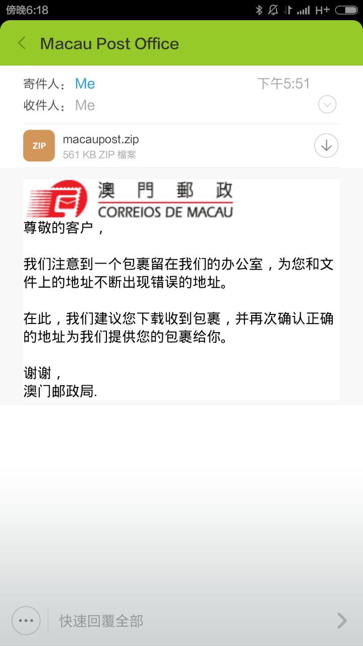 A Direcção dos Serviços de Correio recomenda ao público para estar vigilante e prestar atenção a um correio electrónico escrito em chinês simplificado, contendo o logotipo destes Serviços, que solicita ao destinatário a divulgação do seu endereço (por favor consulte a imagem para detalhes). O nome de domínio do remetente é diferente do nome de domínio destes Serviços: "macaupost.gov.mo". Os Correios de Macau esclarecem que não enviaram o correio electronico em questão para os seus clientes. Dado que o documento de zip "macaupost.zip" do correio electrónico, a este anexado, contém vírus informáticos, o público é aconselhado a não o descarregar.