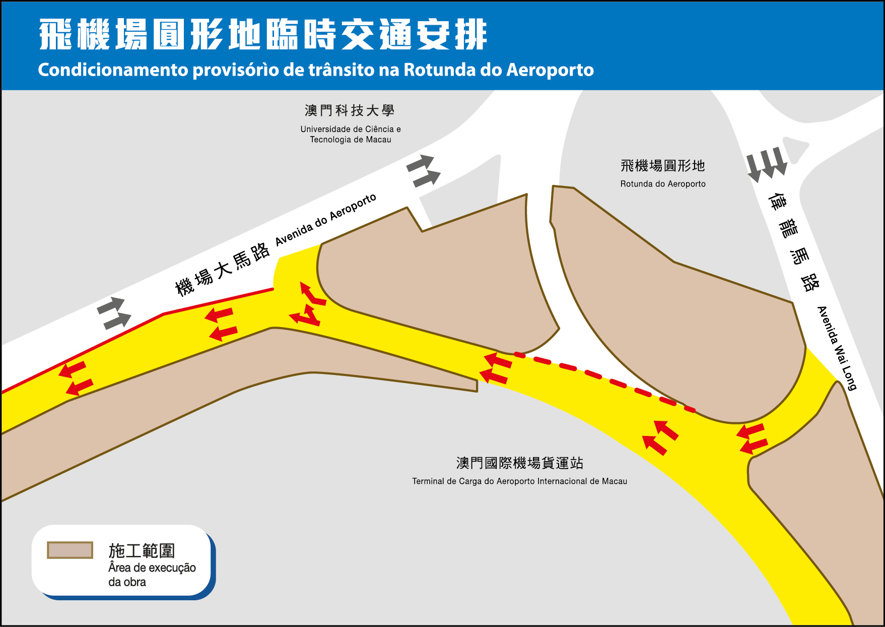 Os trabalhos de elevação e montagem das peças pré-fabricadas do Metro Ligeiro continuam a ser executados ao longo da Avenida Wai Long, e vão estender da Rotunda do Aeroporto da Taipa à Avenida do Aeroporto. Tendo em consideração a segurança de execução e de circulação de veículos dos condutores durante o período de elevação e montagem, um troço entre a Rotunda do Aeroporto e a Avenida do Aeroporto será temporariamente encerrado, a partir de quarta-feira (dia 8). Tendo como objectivo manter o fluxo de tráfego desta artéria principal, uma faixa de rodagem temporária foi criada pelos empreiteiros na Avenida do Aeroporto, para facilitar a circulação de veículos do Aeroporto Internacional de Macau à Universidade de Ciência e Tecnologia de Macau, com o prazo de execução de 30 dias.