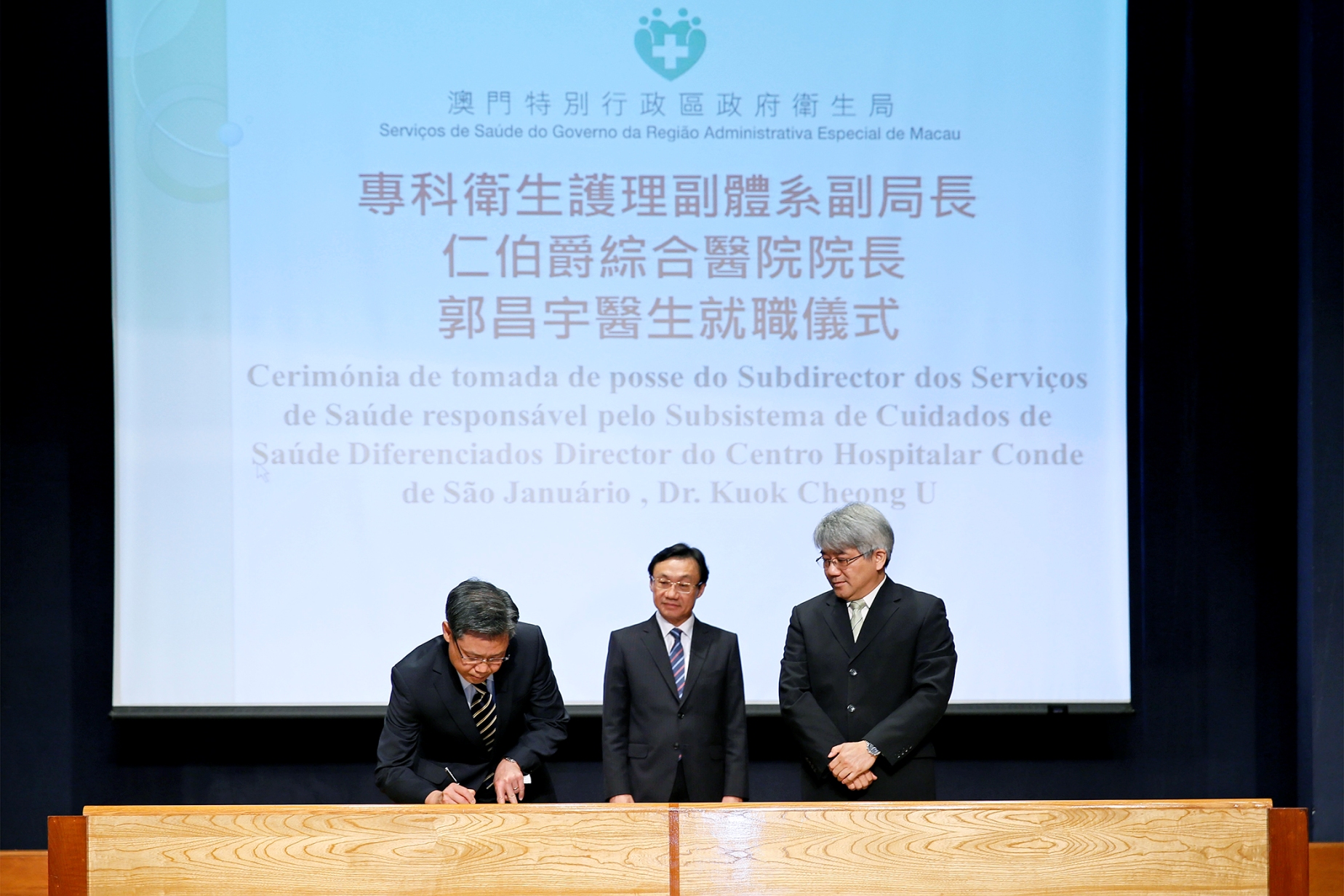 Teve lugar esta segunda-feira, 4 de Maio de 2015, a cerimónia de tomada de posse do Senhor Dr. Kuok Cheong U como subdirector dos Serviços de Saúde e director do Centro Hospitalar Conde de São Januário que decorreu no auditório do Edifício de Administração dos Serviços de Saúde.