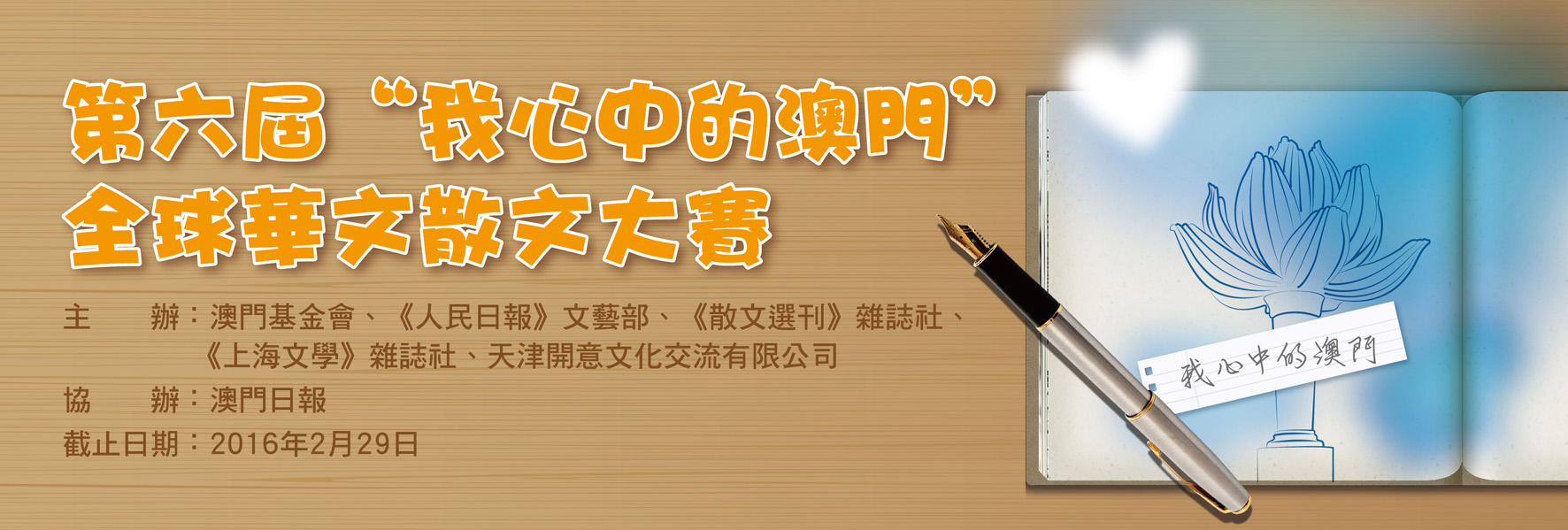 Pela ocasião da comemoração do 16.º aniversário do estabelecimento da RAEM, e para se dar a conhecer mais histórias bonitas que aconteceram em Macau, é organizada a 6.ª edição do Concurso Global de Prosas em Língua Chinesa sobre o tema “Macau no meu Coração”, com a organização conjunta da Fundação Macau, Departamento de Literatura e Artes do Jornal “Diário do Povo”, Revista “Prosas Seleccionadas”, Editora “Literatura de Shanghai” e da Sociedade de Intercâmbios Culturais Kaiyi de Tianjin, e com a colaboração do Jornal Ou Mun. Esta Acção tem por objectivo fomentar a criação literária em língua chinesa, divulgando-a por todo o mundo, através da realização de um Concurso que tem por base os princípios de justiça e imparcialidade.
