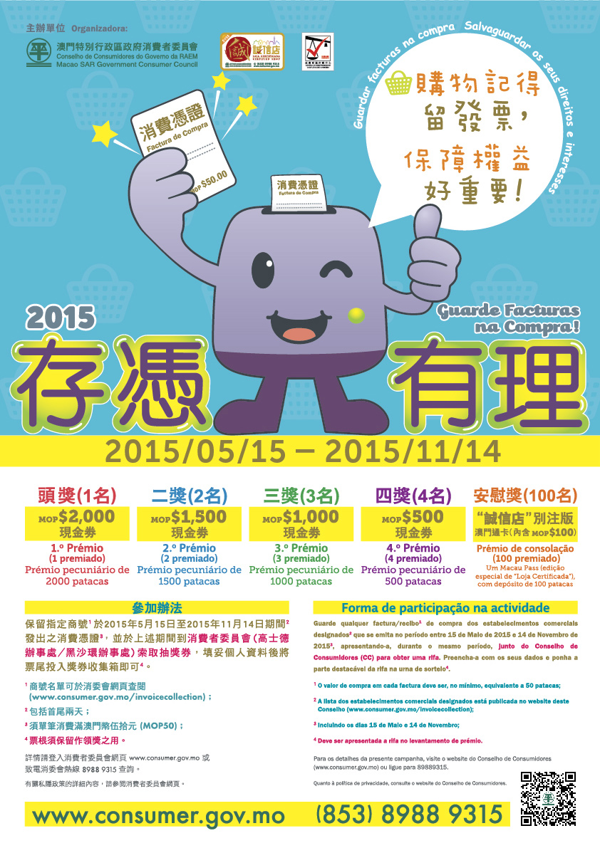 Após a realização do referido evento no ano passado, o C.C. procedeu uma recolha de opiniões por meio de um inquérito, e, os inqueridos mostraram a favor da continuidade e alargamento do respectivo evento, uma vez que este ele permite aumentar a sensibilização dos consumidores no sentido de pedir e guardar, por iniciativa própria, as facturas. O C.C. acredita que com a divulgação do mesmo evento a longo prazo, poder-se-á incutir aos consumidores o hábito de “pedir recibos e guardar recibos”. Nesse sentido, o C.C. pretende realizar, uma vez mais, o mesmo evento que decorre entre 15 de Maio e 14 de Novembro, e, para aderí-lo, basta apresentar as facturas emitidas pelas lojas aderentes ao referido evento no valor total igual ou acima de 50 patacas que levam uma etiqueta de identificação intitulada “Guarde Facturas na Compra”, junto do Conselho de Consumidores (Avenida de Horta e Costa, n.º 26, ou, Rua Nova da Areia Preta, n.º 52, Centro de Serviços da RAEM, 1.º andar, Zona M) e serão entregues posteriormente os bilhetes de sorteio, que depois de serem devidamente preenchidos e metidos na respectiva caixa de recolha de bilhetes de sorteio do C.C., os mesmos terão oportunidade de ganhar prémios, designadamente, o 1º prémio no valor de 2000 patacas (1 vencedor), o 2º prémio no valor de 1500 patacas (2 vencedores), o 3º prémio no valor de 1000 patacas (3 vencedores) e o 4º prémio no valor de 500 patacas (4 vencedores). Haverá também prémio de consolação para 100 vencedores, no valor de 100 patacas em moeda electrónica para edições especiais das “lojas certificadas”. O C.C. referiu que o aumento dos valores pecuniários dos prémios e o número de vencedores para o evento deste ano, tem por objectivo aumentar a oportunidade para os consumidores ganharem prémios ao aderir ao evento, convidando assim a todos para participar ao evento.