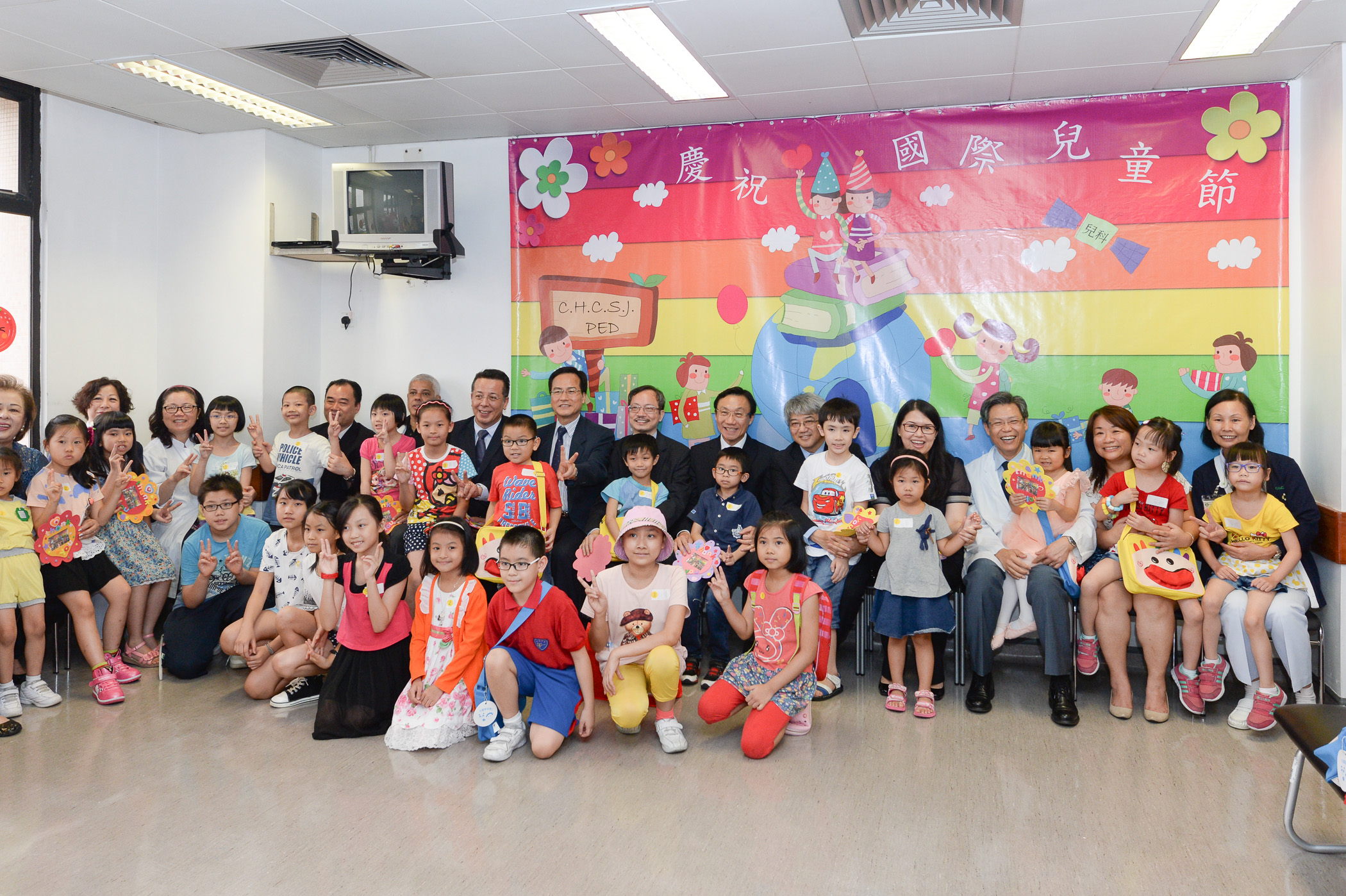 Depois, com o apoio da Associação dos Voluntários Jovens de Macau e dos trabalhadores do Centro Hospitalar Conde de S. Januário, realizou-se uma festa para as crianças internadas e aquelas com internamento a longo prazo no Hospital de Dia, durante a qual, os voluntários conduziam-nas nos jogos interactivos de canções e danças animadas, e na passagem alegre e vivida do Dia Mundial da Criança, bem como no manifestar do apreço do carinho e apoio do Governo da RAEM e dos diversos sectores sociais.