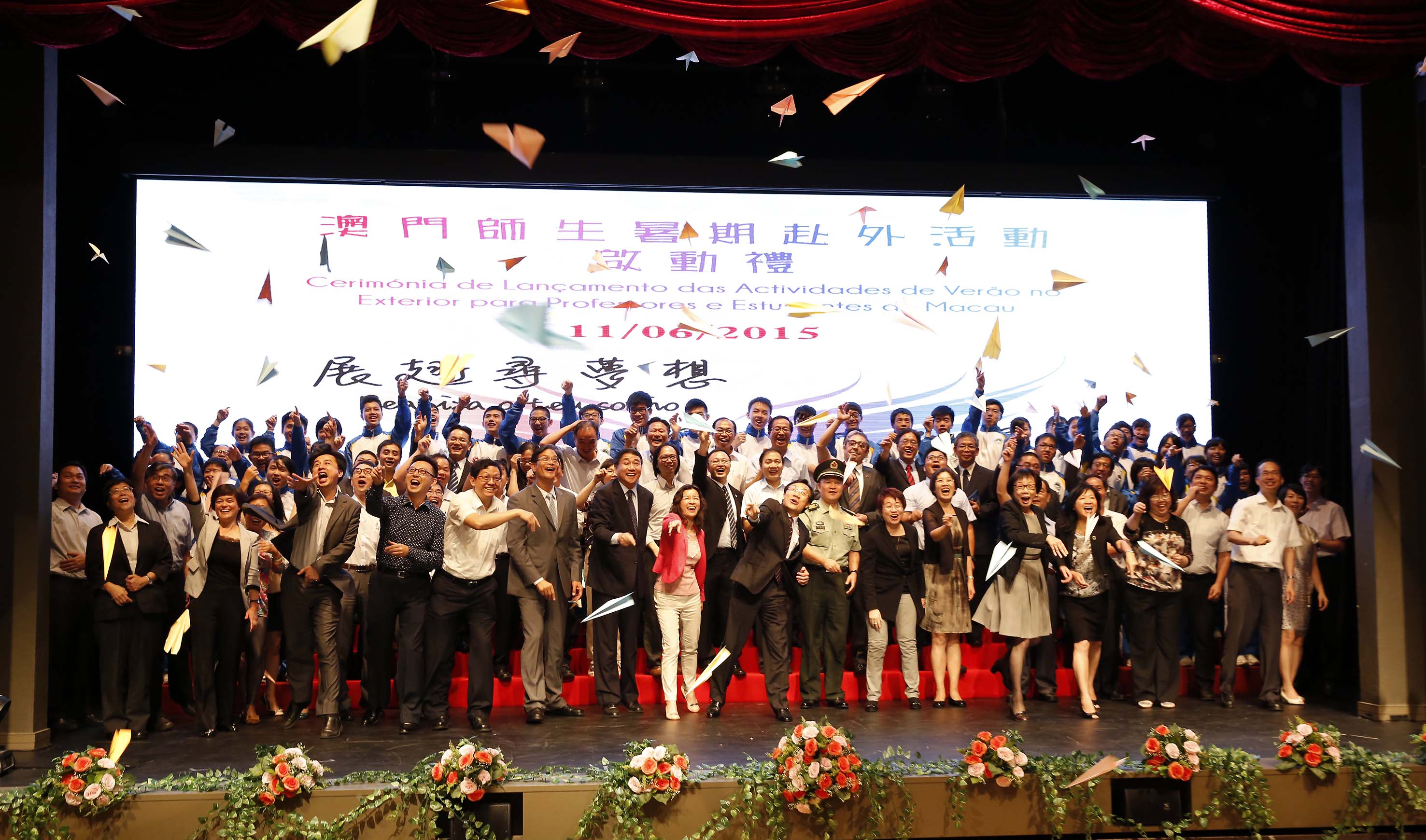 A “Cerimónia de Lançamento das Actividades de Verão no Exterior para Professores e Estudantes de Macau” teve lugar na tarde do dia 11 de Junho, no Auditório da Escola São Paulo e contou com a presença do Secretário para os Assuntos Sociais e Cultura, Alexis, Tam Chon Weng, Directora da DSEJ, Leong Lai, Presidente substituta do Instituto de Acção Social, Wong Im Mui, Subchefe do Estado-Maior da Guarnição em Macau do Exército de Libertação do Povo Chinês, Coronel Chen Zhaoyang, Subdirector do Departamento de Cultura e Educação do Gabinete de Ligação do Governo Popular Central na RAEM, Zhang Xiaoguang, Chefe da Secção da Diplomacia Pública e Imprensa do Comissariado do Ministério dos Negócios Estrangeiros da República Popular da China na RAEM, Li Nan, Assessores do Gabinete do Secretário para os Assuntos Sociais e Cultura, Wai Cheng Iong e Lam Io Pak, Subdirectores da DSEJ, Lou Pak Sang e Kuok Sio Lai, Subdirector da Direcção dos Serviços para os Assuntos Laborais, Lau Wai Meng, e ainda vogais do Conselho de Educação para o Ensino Não Superior, do Conselho de Juventude e do Conselho Profissional do Pessoal Docente, representantes das entidades colaboradoras, os directores das escolas e delegações, envolvendo, ao todo, cerca de 1.000 professores e estudantes.