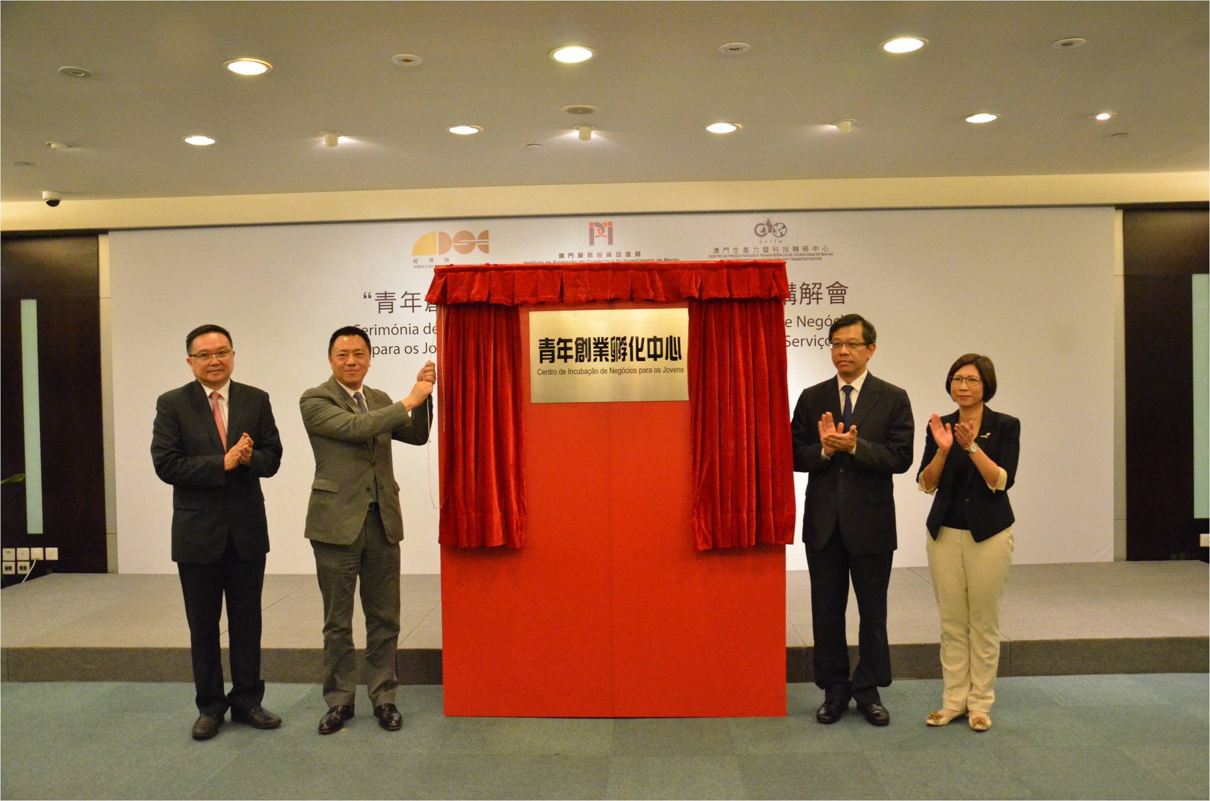 A cerimónia de descerramento de placa do Centro e respectiva sessão de apresentação tiveram lugar no dia 18 de Junho, onde o Secretário para a Economia e Finanças, Dr. Leong Vai Tac, presidiu a cerimónia de descerramento de placa do Centro, em acompanhamento do Director da Direcção dos Serviços de Economia (DSE), Dr. Sou Tim Peng, Presidente do Instituto de Promoção do Comércio e do Investimento de Macau (IPIM), Dr. Cheong Chou Weng, Subdirectora-geral da Direcção do Centro de Produtividade e Transferência de Tecnologia (CPTTM), Dra. Mok Iun Lei, e mais de 30 representantes provenientes de associação comerciais e associações de juvenis de Macau testemunharam a criação oficial do Centro de Incubação de Negócios para os Jovens. O Director da DSE, Dr. Sou Tim Peng, referiu durante o seu discurso que, o Centro é a prestação, sempre actualizada, de apoio ao empreendedorismo diversificado para os jovens de Macau, e através da prestação a jovens empreendedores, de serviços de apoio one stop, incluindo formação nesta matéria, consultadoria e assessoria, espaço para trabalho, bolsa de contactos comerciais e informações de mercados, incumbir as suas ideias de empreendorismo, coadjuvando os jovens empreendedores a escolher as melhores opções de caminho, bem como promover o desenvolvimento e o crescimento das empresas de jovens empreendedores.