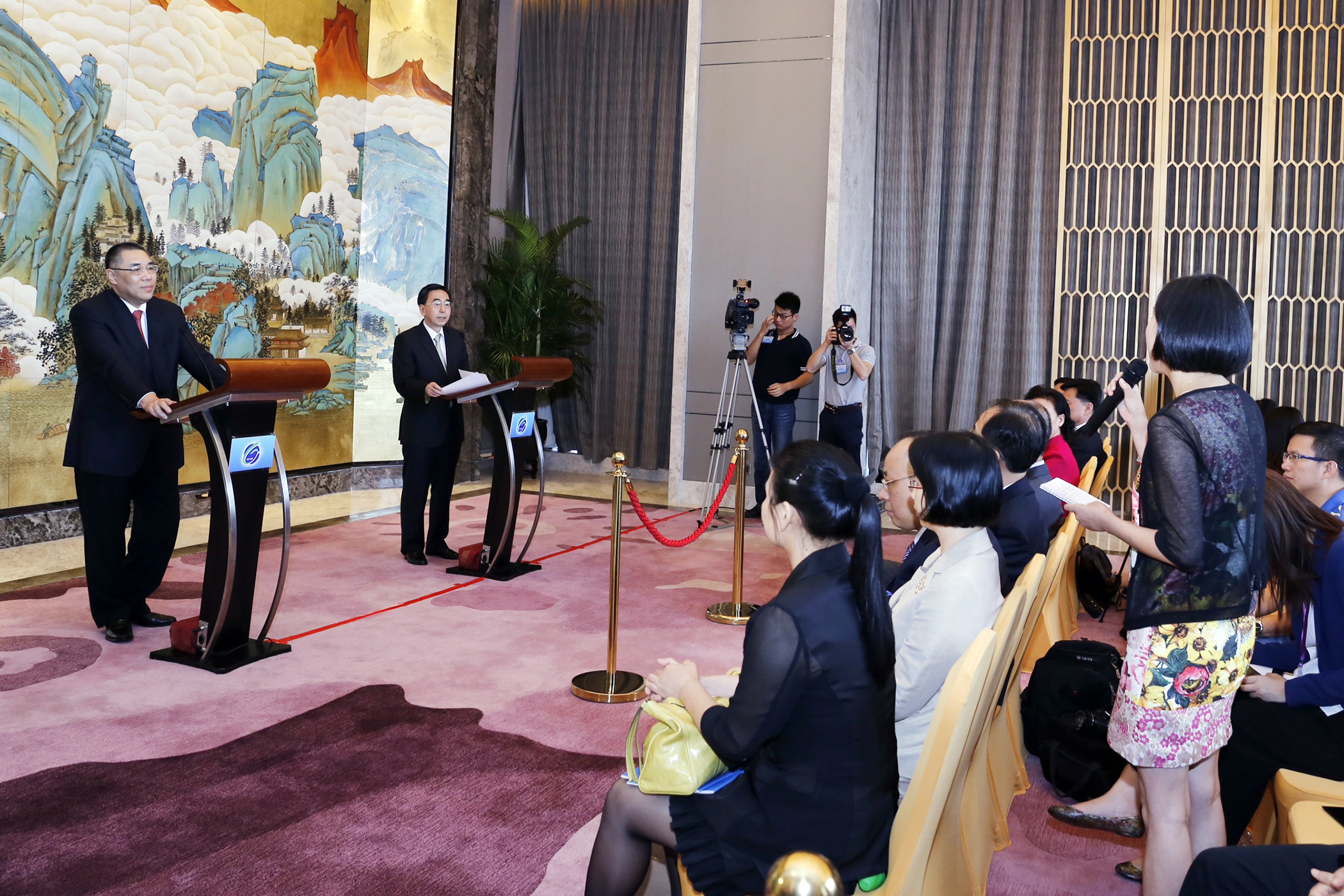 No final da Conferência de Cooperação Conjunta Guangdong – Macau 2015 que decorreu, esta tarde, na cidade de Jiangmen na Província de Guangdong, o Chefe do Executivo, Chui Sai On, e o governador da Província de Guangdong, Zhu Xiaodan, tiveram um encontro com a comunicação social durante o qual fizeram um balanço.