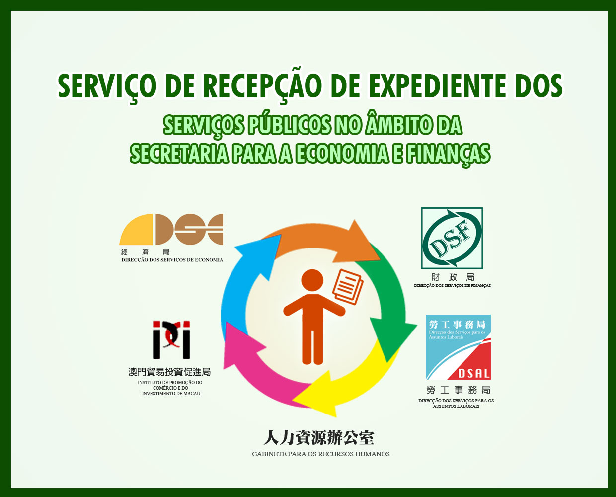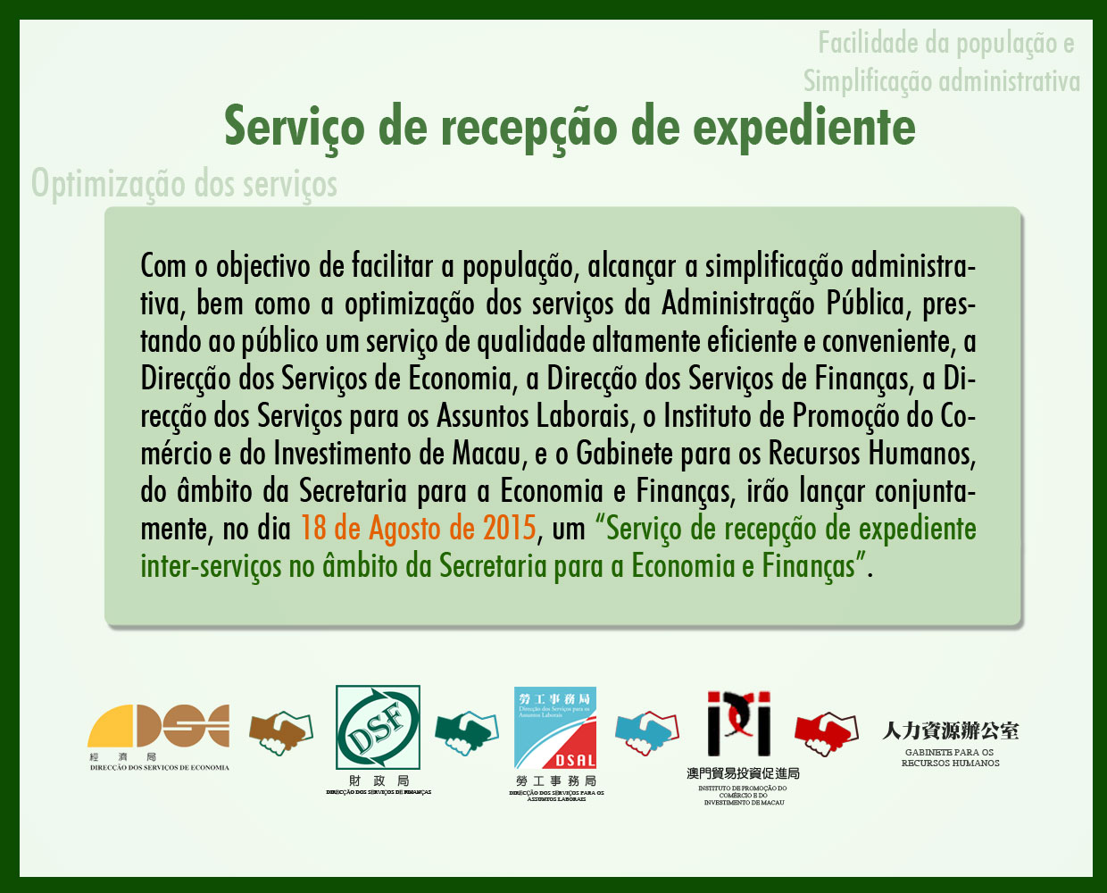 Com o objectivo de facilitar a população, alcançar a simplificação administrativa, bem como a optimização dos serviços da Administração Pública, prestando ao público um serviço de qualidade altamente eficiente e conveniente, a Direcção dos Serviços de Economia, a Direcção dos Serviços de Finanças, a Direcção dos Serviços para os Assuntos Laborais, o Instituto de Promoção do Comércio e do Investimento de Macau, e o Gabinete para os Recursos Humanos, do âmbito da Secretaria para a Economia e Finanças, irão lançar conjuntamente, no dia 18 de Agosto de 2015, um “Serviço de recepção de expediente inter-serviços no âmbito da Secretaria para a Economia e Finanças”.