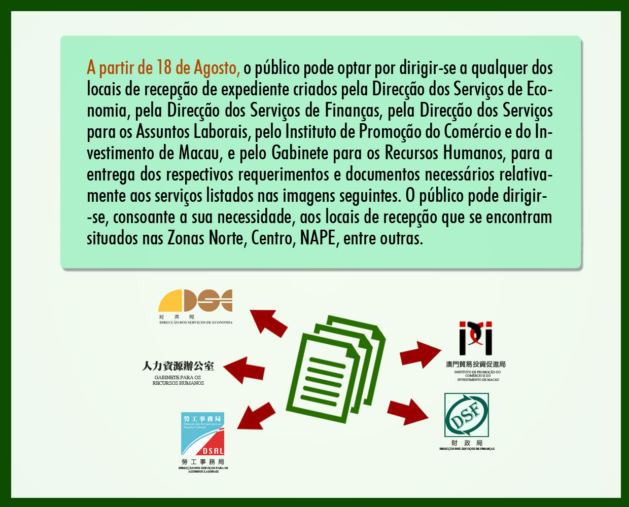 A partir de 18 de Agosto, o público pode optar por dirigir-se a qualquer dos locais de recepção de expediente, criados por aquelas Entidades, para a entrega dos respectivos requerimentos e documentos necessários relativamente aos serviços listados (ver anexo). O público pode dirigir-se, consoante a sua necessidade, aos locais de recepção que se encontram situados nas Zonas Norte, Centro, NAPE, entre outras.