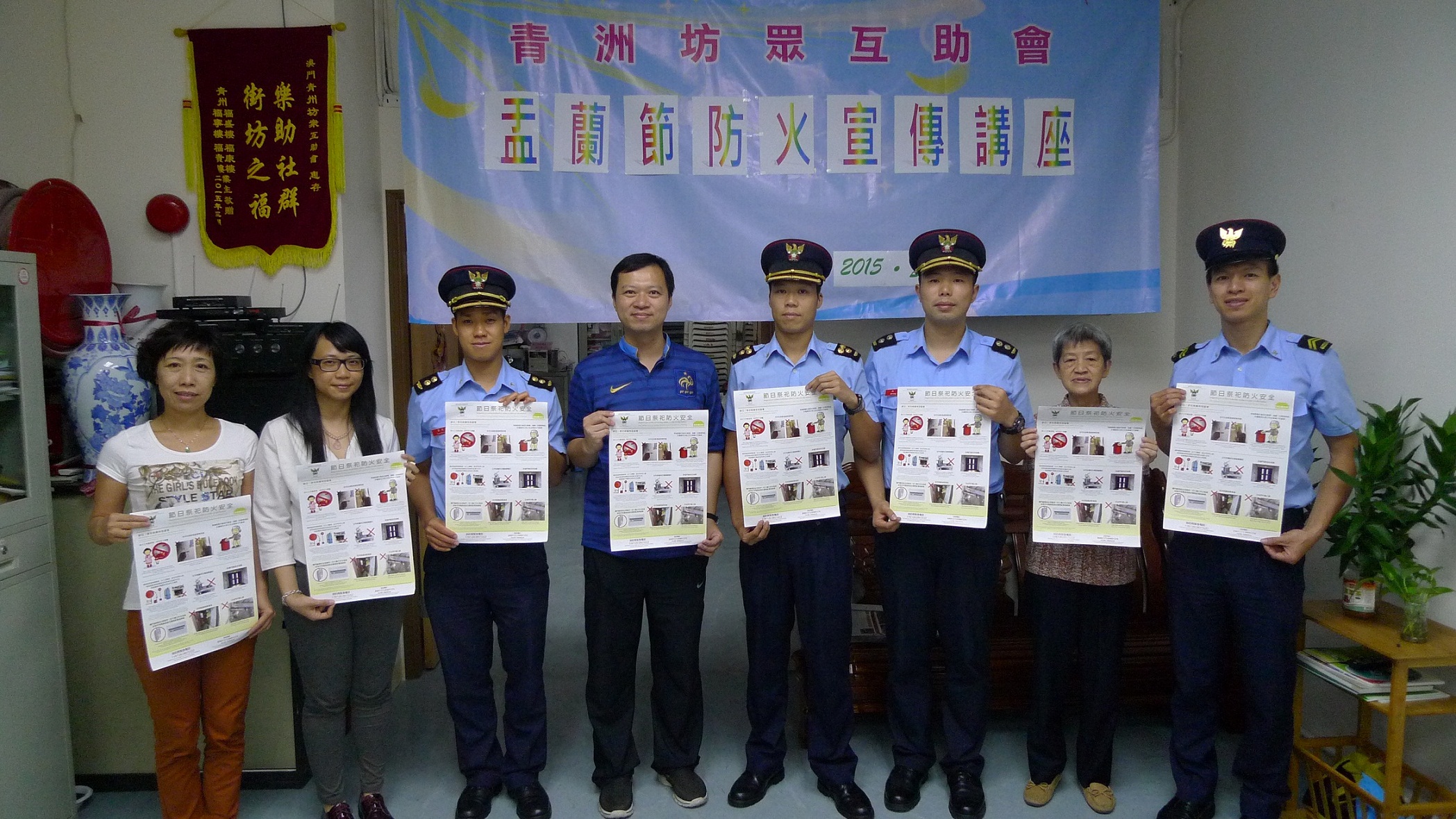 No dia 24 de Agosto, o CB enviou oficiais para visitar a Associação de Beneficência e Assistência Mútua dos Moradores do Bairro da Ilha Verde, foram apresentadas na qual as acções de sensibilização da prevenção contra incêndios na Festa dos Espíritos Esfomeados e respectivos trabalhos preparatórios, e foram ouvidas as opiniões sobre as acções de prevenção e combate a incêndios e de salvamento, realizando ainda uma palestra aos seus membros. Em seguida, os voluntários ajudaram a distribuir materiais promocionais na zona. Ontem (25 de Agosot), teve lugar uma palestra na Aliança de Povo de Instituição de Macau, de modo a fornecer aos seus membros conhecimentos sobre as técnicas de auto-socorro e de salvamento, bem como alertá-los para avisarem o mais rápido possível o CB em caso de incêndios.