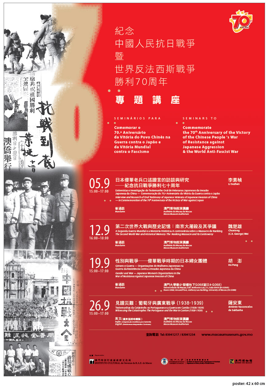 Em comemoração do 70o aniversário da vitória contra o Japão, o Governo da R.A.E. de Macau e o Gabinete de Ligação do Governo Popular Central na R.A.E. de Macau organizaram conjuntamente uma “Exposição Comemorativa do 70.º Aniversário da Vitória do Povo Chinês na Guerra contra o Japão e da Vitória Mundial contra o Fascismo”. O evento é realizado pelo Gabinete de Comunicação Social, pelo Instituto Cultural (IC) e pelo Macau Daily News, com o apoio do Instituto para os Assuntos Cívicos e Municipais e da Direcção dos Serviços de Educação e Juventude. Em conjunto com a exposição, o Museu de Macau, sob a égide do Instituto Cultural e o Departamento de História da Faculdade de Ciências Sociais da Universidade de Macau (UM) organizam conjuntamente o Seminário especial "Testemunhas da Catastrofe: os Portugueses e a Guerra em Cantão (1938-1939)", no dia 26 de Setembro, das 15:00 às 17:00 horas, apresentado pelo Prof.António Vasconcelos de Saldanha, Professor do Departamento de História da Universidade de Macau. O seminário é gratuito e os lugares são limitados. Todos os interessados deverão inscrever-se nos seminários.