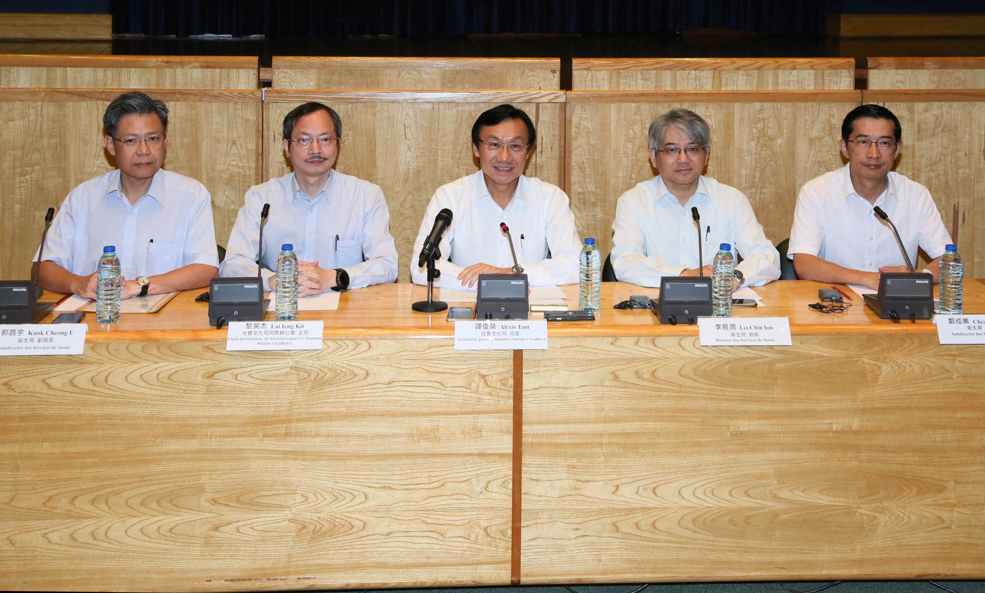 A conferência de imprensa, foi presidida pelo Sercretário dos Assuntos Sociais e Cultura, Alexis Tam, acompanhado do seu chefe de Gabinete, Dr. Lai Ying Kit, o Director dos Serviços de Saúde, Dr. Lei Chin Ion, o Director do Centro Hospitalar Conde de São Januário e cumulativamente Subdirector dos Serviços de Saúde, Dr. Kuok Cheong U e o Subdirector dos Serviços de Saude, Dr. Chang Seng Ip.
