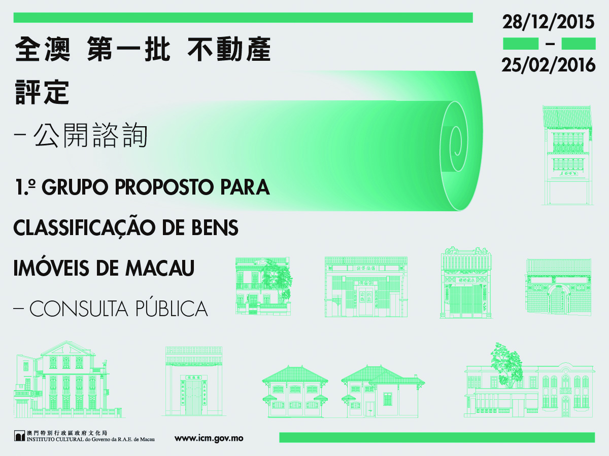O Instituto Cultural (IC), segundo a Lei de Salvaguarda do Património Cultural, deu recentemente abertura ao procedimento de classificação do 1.º grupo de 10 bens imóveis. Além disso, o IC realizará sessões de consulta pública que decorrerão 60 dias, a partir de 28 de Dezembro e até ao dia 25 de Fevereiro de 2016. A primeira sessão terá lugar no dia 9 de Janeiro, no Auditório do Museu Macau, na Fortaleza do Monte, na qual o público é bem-vindo a expressar as suas opiniões.