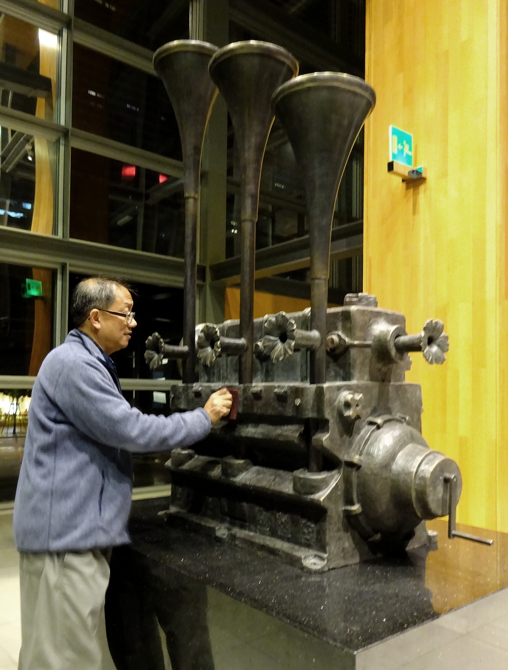 Nascido em Macau em 1959, Sou Pui Kun concluiu a licenciatura no Departamento de Belas-Artes da Universidade Normal de Taiwan, o mestrado em Cerâmica e Design Industrial na Academia de Belas-Artes de Guangzhou e o doutoramento em História pela Universidade de Jinan, em Guangzhou. Sou Pui Kun é actualmente professor associado da Escola de Artes do Instituto Politécnico de Macau. Publicou a obra Estudos sobre Interacção Cultural: Função da Loiça azul e branca na Dinastia Ming, 2007. Sou considera que uma vida com baixos níveis de carbono está cada vez mais próxima, dado que autocarros eléctricos já começam a circular entre as grandes cidades das redondezas e que as ruas, ainda que não se tornem mais sossegadas, testemunharão um decréscimo gradual nos barulhentos motores a diesel. O escultor espera transformar esta escultura feita com “antiguidades” descartadas numa caixa de música ou num megafone que torne o seu barulho em belas melodias.
