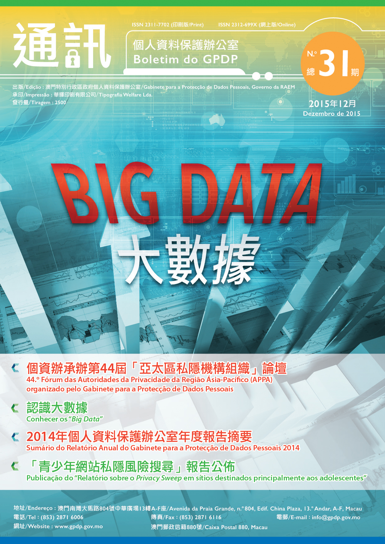 Está já disponível a mais recente edição (n.º 31) do Boletim do GPDP, publicado pelo Gabinete para a Protecção de Dados Pessoais. O tema desta edição é os “big data”: para além da apresentação do desenvolvimento dos “big data”, há uma entrevista com um especialista, na qual analisa as potencialidades dos “big data” em Macau e discute as relações entre os “big data” e a privacidade. É ainda publicada neste Boletim a notícia da realização pelo GPDP, em Dezembro do ano passado, do Seminário sobre “Big data, desafio crucial – Protecção da Privacidade e Cooperação”.