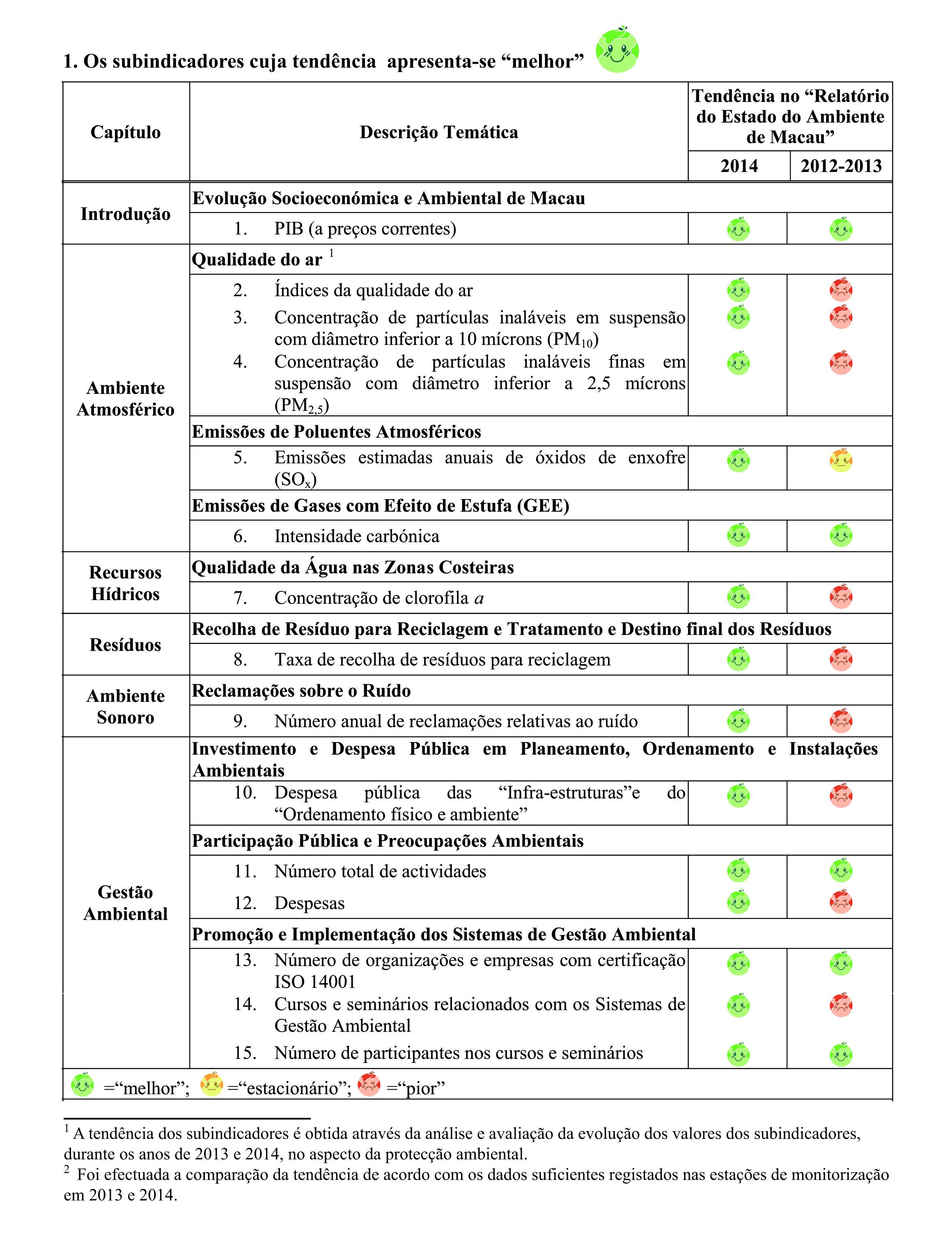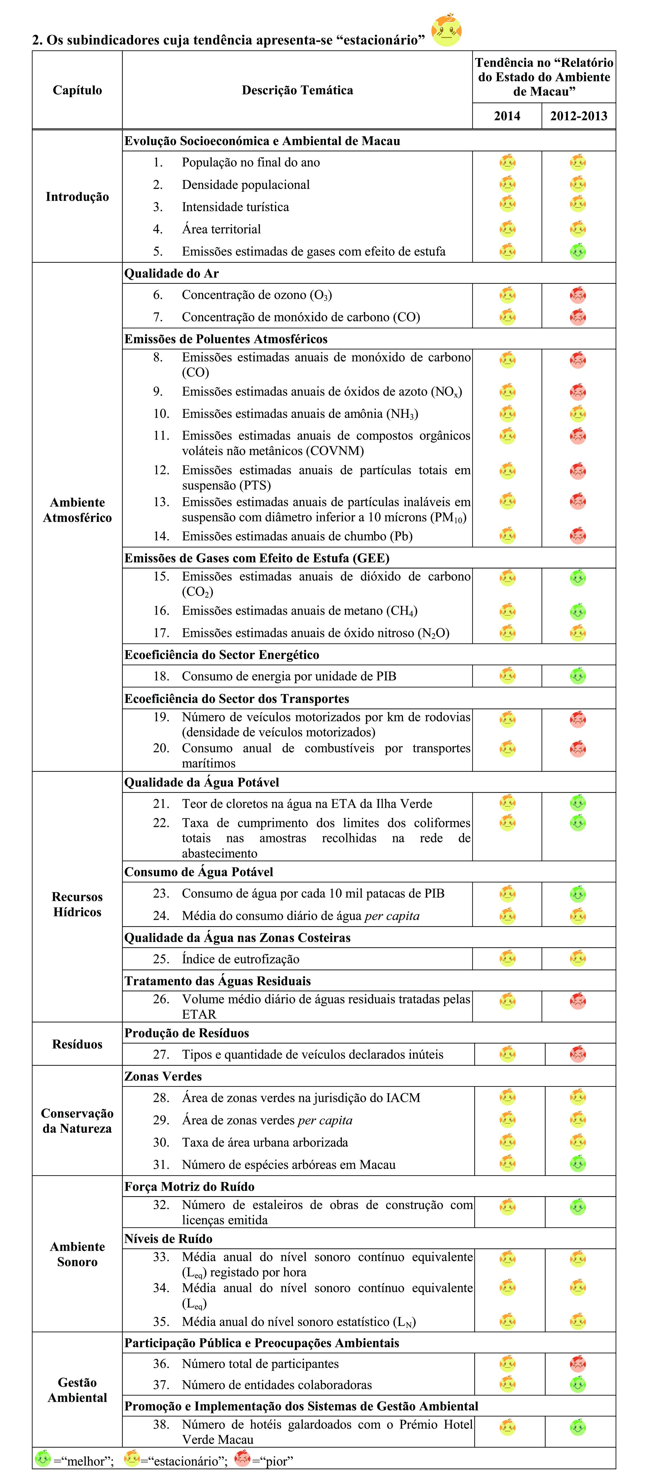 Dentro dos 19 principais indicadores ambientais, divididos num total de 82 subindicadores, analisados no presente Relatório, 15 subindicadores (cerca de 18,3%) apresentam uma tendência de evolução “melhor”, incluindo os de Índice da qualidade do ar, da Intensidade carbónica e Número de participantes nos cursos e seminários sobre os sistemas de gestão ambiental; 38 subindicadores (cerca de 46,3%) apresentam uma tendência de evolução “estacionário”, incluindo os de Emissões estimadas de gases com efeito de estufa (GEE), Intensidade turística, Emissões estimadas das diversas fontes de poluentes atmosféricos, Taxa de área urbana arborizada e Níveis de ruído; 26 subindicadores (cerca de 31,7%) apresentam uma tendência de evolução “pior”, incluindo os de Consumo de electricidade, Consumo de água facturada, Volume de resíduos transportados para serem tratados na Central de Incineração de Resíduos Sólidos de Macau e Índice geral de qualidade das águas das zonas costeiras.