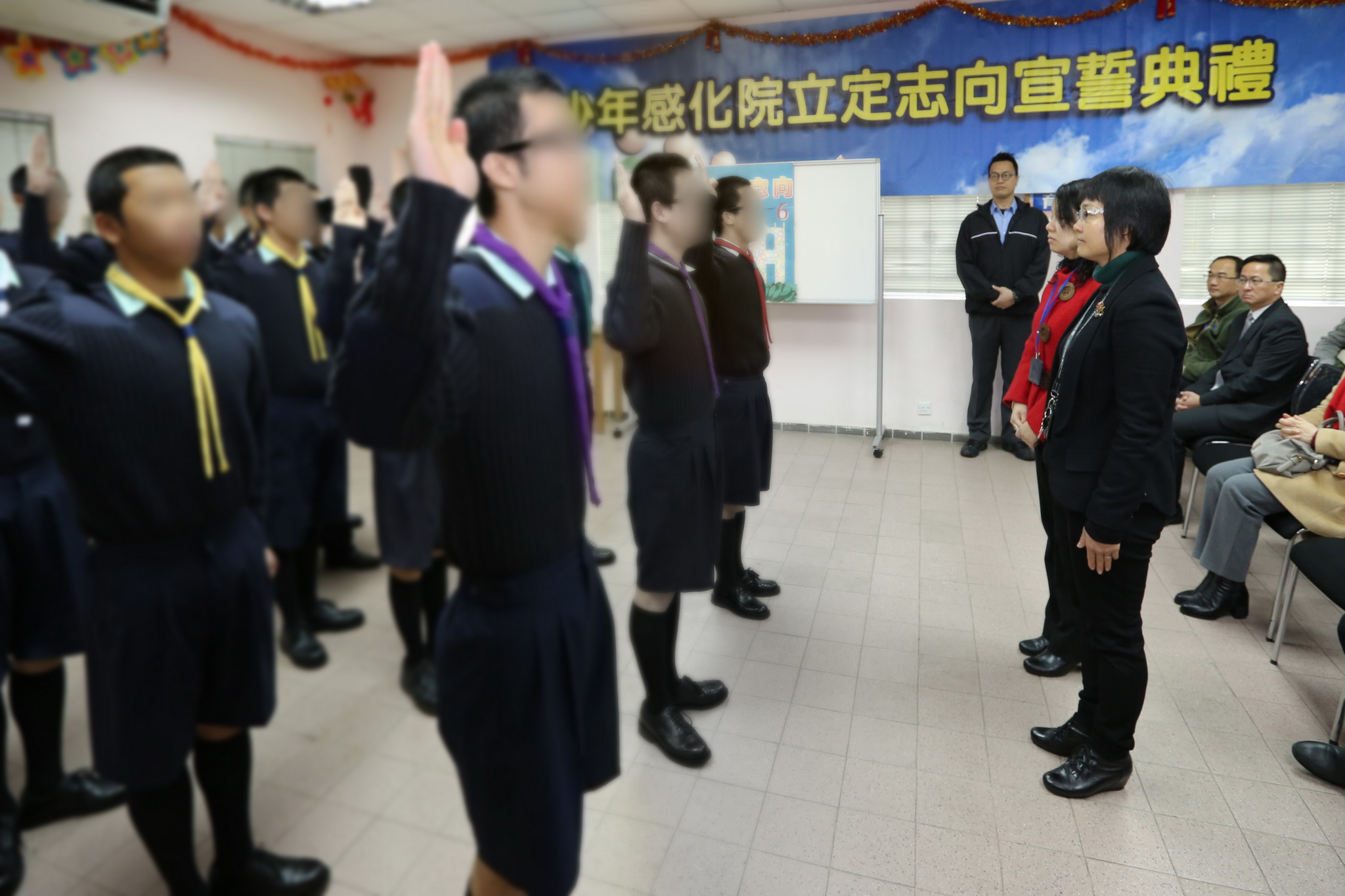 Realizou-se, nas instalações do Instituto de Menores, a Cerimónia de Juramento, presidida pela Directora da Direcção dos Serviços Correccionais substituta, Loi Kam Wan e Directora do Instituto de Menores, Yu Pui Lam. Sob a ordem do líder, os internados marcharam em direcção ao local da cerimónia. Na presença dos convidados, dos monitores das alas masculina e feminina do IM e dos encarregados de educação, os internados, em desfile organizado, prestaram solenemente juramento e afixaram os dísticos com os objectivos escritos, por forma a intensificar a vontade firme de os atingir. O objectivo do líder masculino, Ah Fai (nome fictício), para este ano é “Ensinar terceiros com o seu próprio exemplo”, o qual espera que possa edificar uma imagem positiva dentro da comunidade, observando as regras institucionais e prestando apoio aos companheiros na resolução de problemas. Relativamente à líder feminina, Ieng Ieng (nome fictício), esta deu, no ano transacto, o primeiro passo, no sentido de manter-se firme em redigir semanalmente uma carta à família, intensificando a comunicação com os progenitores. E, neste ano, a jovem definiu o objectivo de preservar a consolidação e a continuidade da relação familiar.