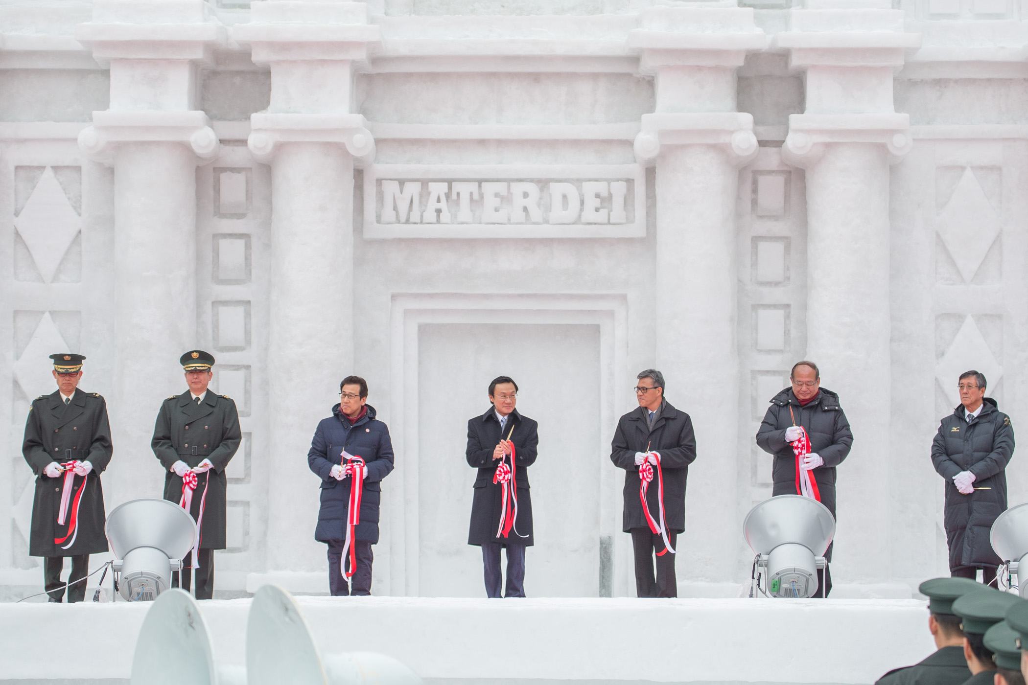 O Governador de Sapporo, Katsuhiro Akimoto, a par com o presidente do Comité Executivo do Festival de Neve de Sapporo, Hisao Hoshino, o Presidente da HBC, Takashi Watanabe, o Comandante do Grupo de Sinal do Exército do Norte, do Grupo Terrestre de Auto-defesa do Japão, Kazuhiro Oka, o Chefe do Gabinete do Secretário para os Assuntos Sociais e Cultura, Ip Peng Kin, a Directora da DST, Maria Helena de Senna Fernandes, o Assessor do Gabinete do Secretário para os Assuntos Sociais e Cultura, Charles Lam, a Chefe do Departamento de Promoção Turística da DST, Betty Fok, entre outros, participaram na cerimónia de entrega da escultura de neve das Ruínas de S. Paulo.