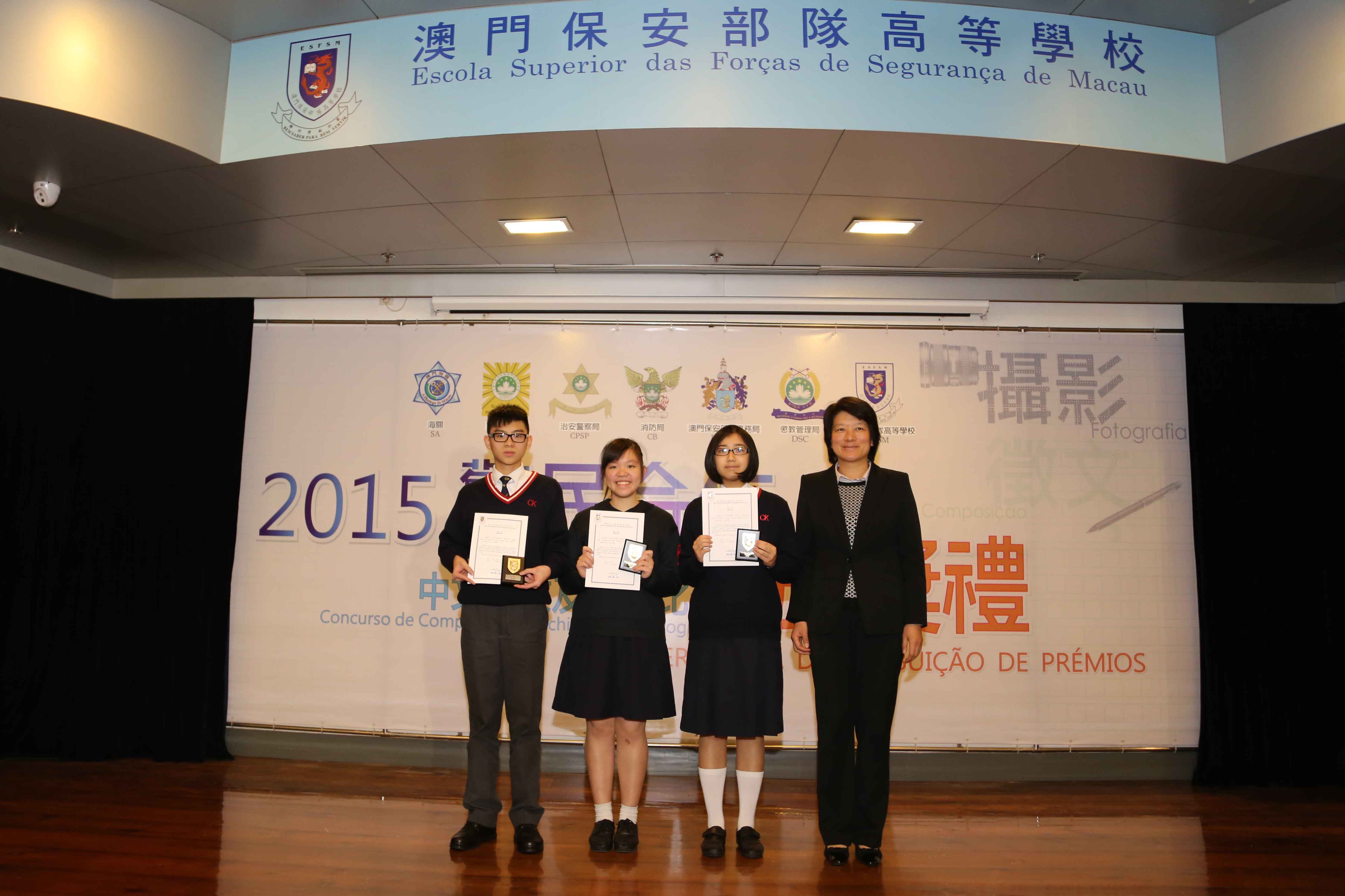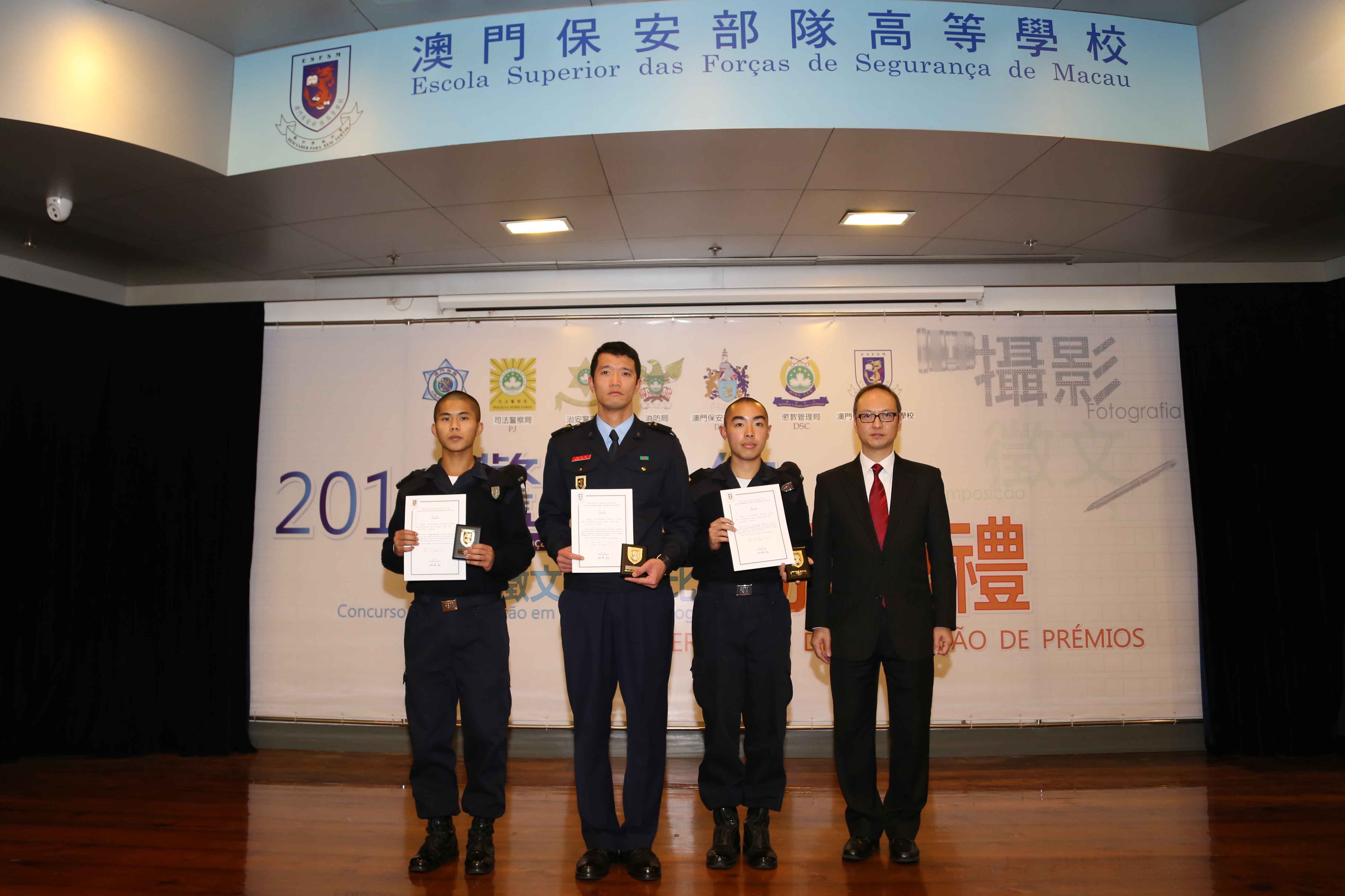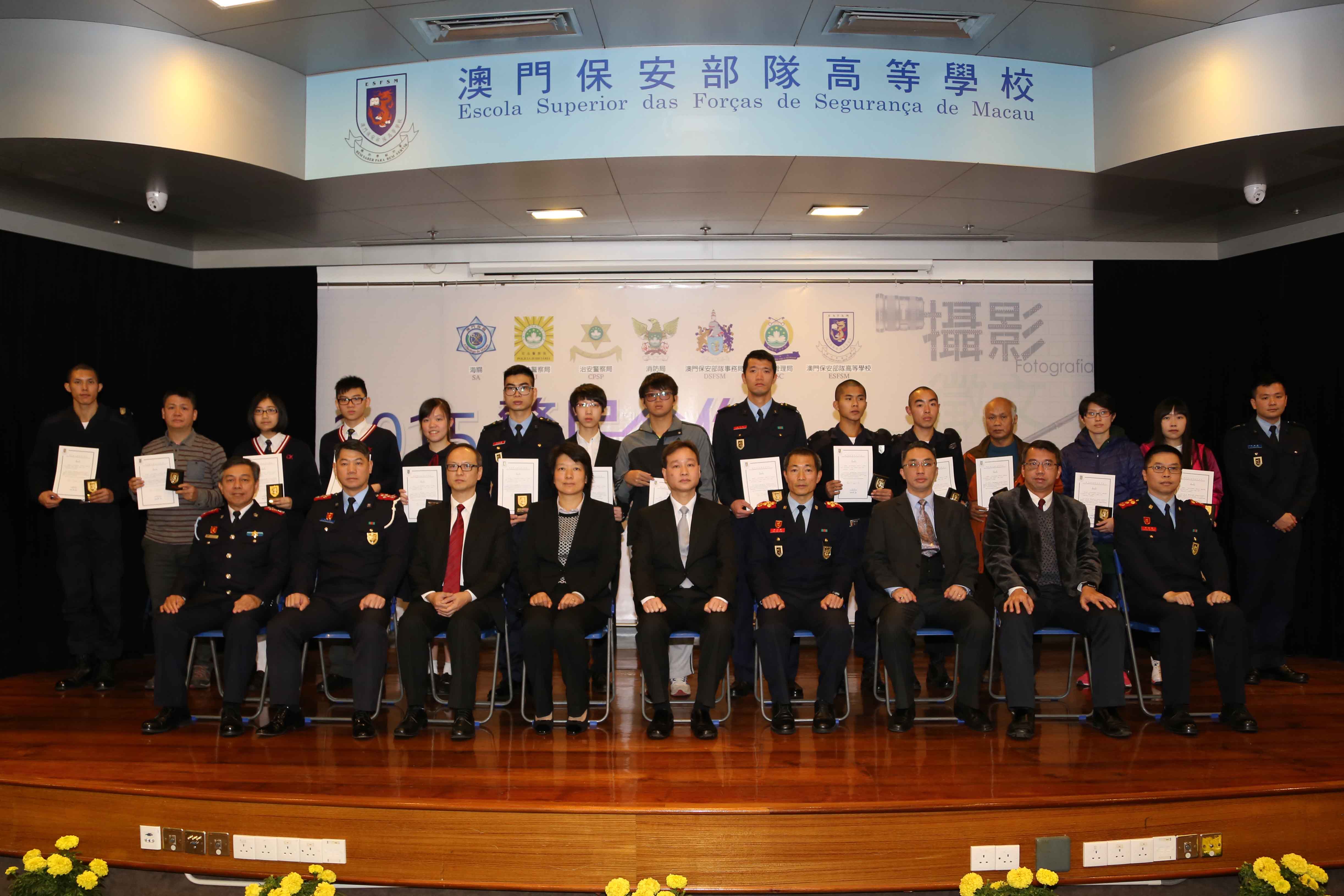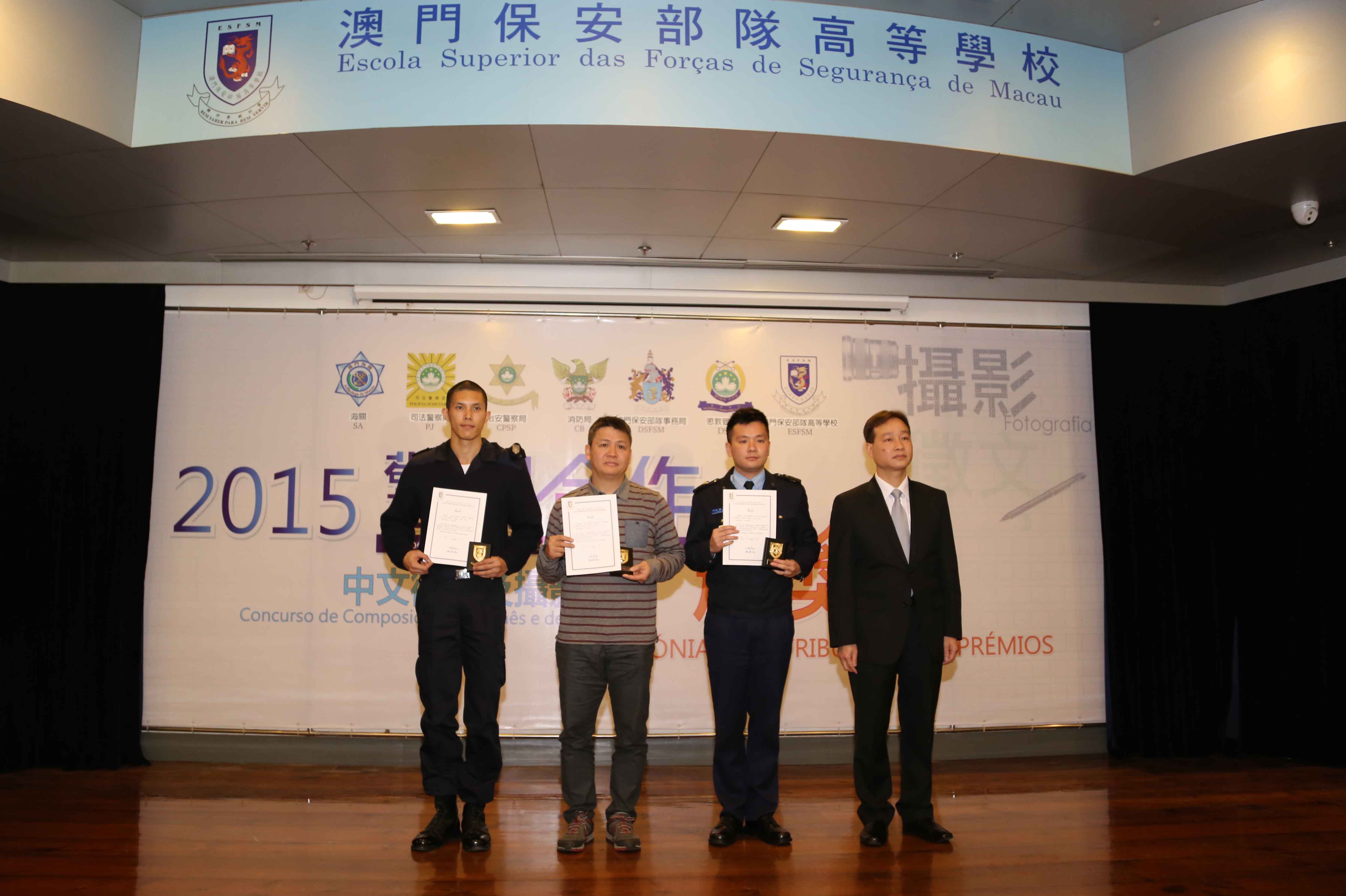 Teve lugar, no dia 5 de Fevereiro de 2016, no auditório da Escola Superior das Forças de Segurança, a Cerimónia de Atribuição de Prémios dos Concursos de Composição em Língua Chinesa e de Fotografia, subordinados ao tema “Cooperação entre a Polícia e a População”, realizada conjuntamente pelas Forças de Segurança de Macau e por vários serviços de segurança. Os representantes das Forças de Segurança, dos Serviços de Segurança, das Instituições de Ensino Superior, das Escolas Secundárias e de todas as unidades premiadas deslocaram-se para participar a mesma cerimónia, perfazendo um total de acerca de 180 pessoas.