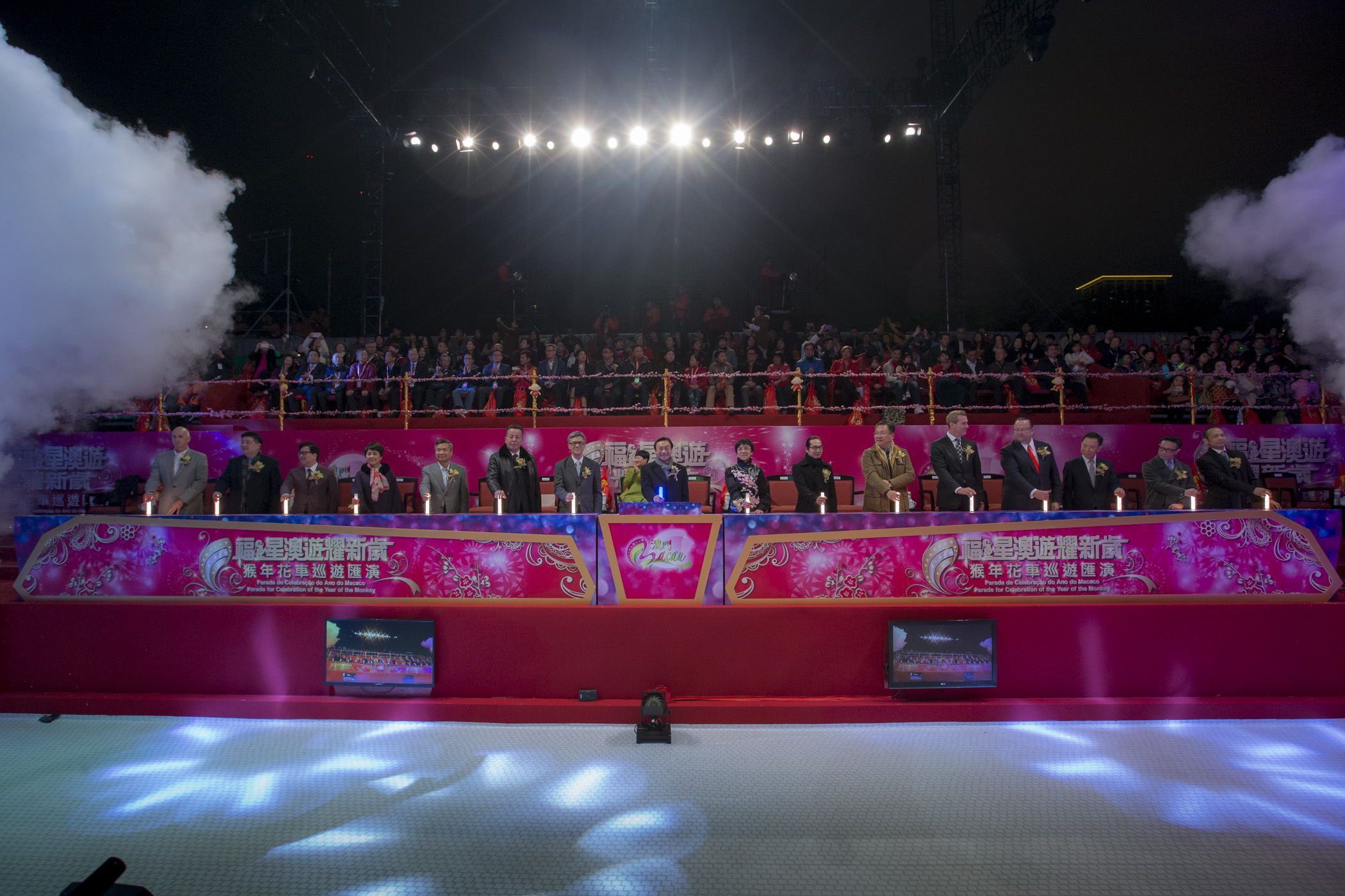O Secretário para os Assuntos Sociais e Cultura (SASC), Alexis Tam, o chefe do Gabinete do SASC, Ip Peng Kin, a directora da Direcção dos Serviços do Turismo (DST), Maria Helena de Senna Fernandes, o presidente do Instituto do Desporto (ID), José Tavares, o vice-presidente do Instituto Cultural (IC), Chan Peng Fai, o administrador do Conselho de Administração do Instituto para os Assuntos Cívicos e Municipais (IACM), Ma Kam Keong, e o director do Centro de Intercâmbio de Turismo da Ásia em Hong Kong da Administração do Turismo da China (CNTA na sigla inglesa), Li Jianping, entre outros convidados, presidiram à cerimónia de arranque da parada, realizada pelas 19h30, em frente ao Centro de Ciência de Macau. O famoso cantor de Hong Kong, Pakho Chau, actuou no evento e os artistas de Hong Kong, 6Wing e Kitty Yuen, foram os apresentadores da cerimónia, para animar a atmosfera do evento.