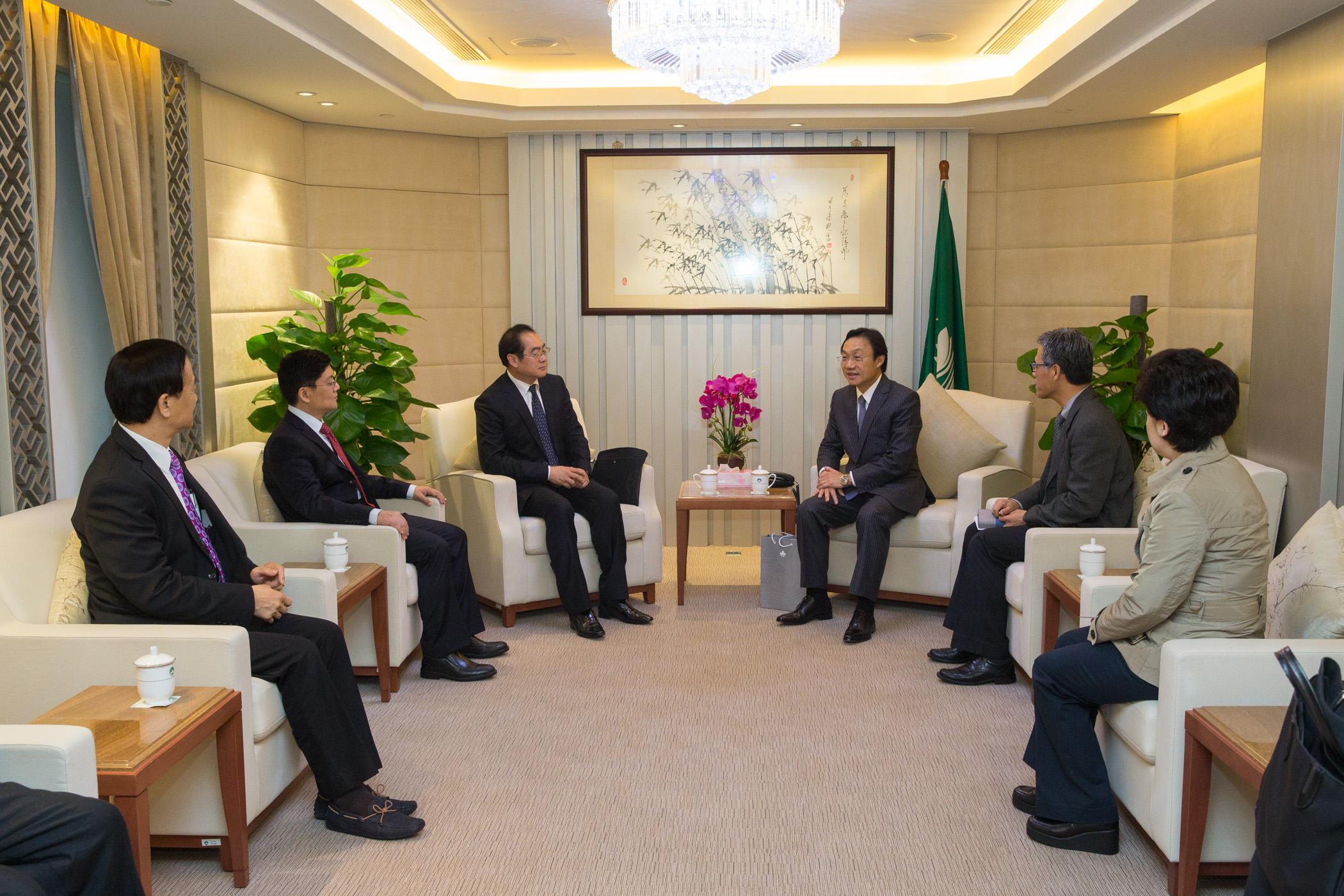 Estiveram também presentes no encontro o director-geral adjunto do Departamento para a Comunicação do Gabinete para os Assuntos dos Chineses Ultramarinos junto do Conselho de Estado, Liu Weijie, o chefe de divisão, Wang Jian, o subchefe de divisão do Departamento para os Assuntos de Hong Kong, Macau e Taiwan do Gabinete para os Assuntos dos Chineses Ultramarinos junto do Conselho de Estado, Yangbo, a directora executiva da Asia Culture Limited, Guo Jinling, o vice-presidente da Confederação de Chineses Ultramarinos da China e o presidente da Associação Geral dos Chineses Ultramarinos de Macau, Lao Ngai Leong, e o presidente do Conselho de Administração da Associação Geral dos Chineses Ultramarinos de Macau, Wong Pan Seng.