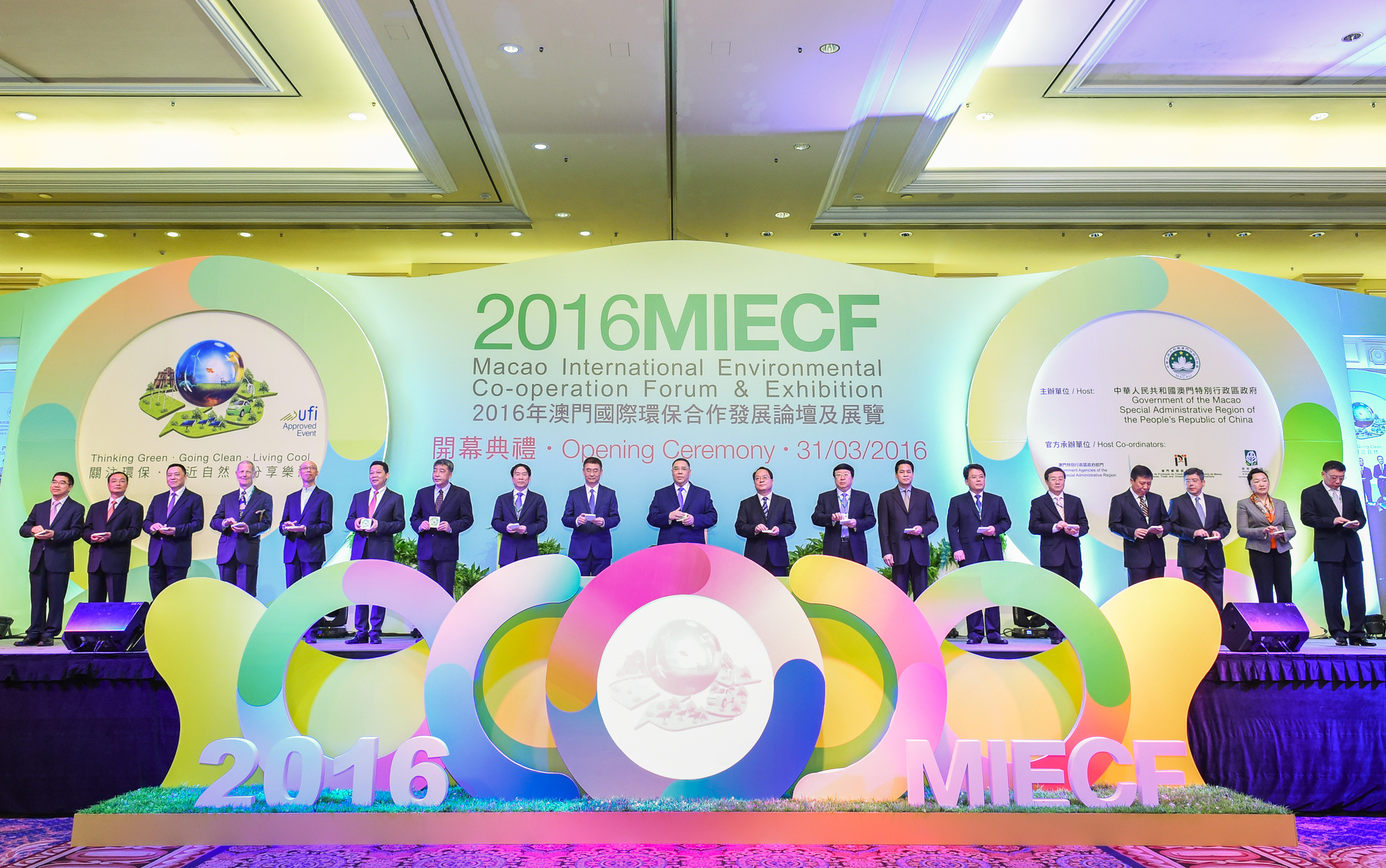Ocorreu, esta manhã, às 10:00 horas, a inauguração oficial de mais uma edição do MIECF, presidida pelos seguines dignitários: Chefe do Executivo da RAEM, Fernando Chui Sai On, director-Adjunto do Gabinete de Ligação do Governo Central Popular na Região Administrativa Especial de Macau, Yao Jin, comissário adjunto do Ministério dos Negócios Estrangeiros da República Popular da China em Macau, Pan Yundong, vice-ministro de Ciência e Tecnologia da República Popular da China, Xu Nanping, vice-governador executivo do Governo Popular da Província de Hunan, Chen Xianqun, vice-governador do Governo Popular da Província de Guangdong, Xu Ruisheng, vice-presidente do Governo Popular da Região Autónoma Zhuang de Guanxi, Haung Shiyong, vice-governador do Governo Popular da Província de Sichuan, Yang Xinping, vice-governador do Governo Popular da Província de Yunnan, Liu Huiyan, secretário para o Ambiente da Região Administrativa Especial de Hong Kong, Wong Kam-Sing, director-geral adjunto do Departamento de Conservação de Recursos e Protecção Ambiental, adistrito à Comissão Nacional para o desenvolvimento e Reforma da República Popular da China, Lu Wenbin, em representação do Presidente da Comissão Nacional para o Desenvolvimento e Reforma da República Popular da China, Xu Shaoshi, Pioneiro da economia circular e criador dos conceitos “Cradle to Cradle” e “Performance Economy”, fundador-director do “The Product-Life Institute, Geneva” e Membro de Pleno Direito do “Club of Rome”, professor Dr. h. c. Walter R. Stahel, director-geral adjunto do Gabinete Geral do Ministério de Protecção Ambiental da República Popular da China, Chen Yanping, em representação do Ministro de Protecção Ambiental da República Popular da China, Chen Jining, secretário para a Economia e Finanças da RAEM, Leong Vai Tac, secretário para os Transportes e Obras Públicas da RAEM, Raimundo do Rosário, secretário-geral adjunto do Governo Popular da Província de Jiangxi, Xie Maolin, directora-geral do Departamento de Protecção Ambiental da Província de Fujian, Zhu Hua, director-geral do Departamento de Ecologia e Protecção Ambiental da Província de Hainan, Deng Xiagang, e director-geral adjunto do Departamento de Protecção Ambiental da Província de Guizhou, Xu Heng.