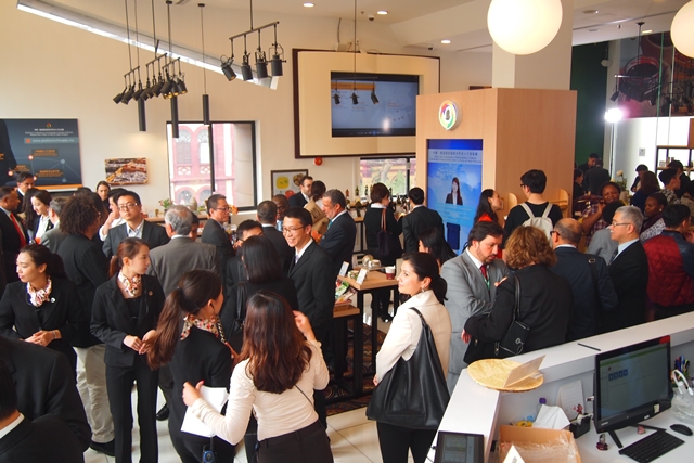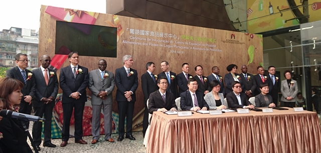 A cerimónia de inauguração e assinatura do Centro de Exposição dos Produtos Alimentares dos Países de Língua Portuguesa teve lugar hoje às 15h00, e foram convidados para presidir à cerimónia o Secretário para a Economia e Finanças do Governo da RAEM, Dr. Lionel Leong Vai Tac, o Director-Geral do Departamento para os Assuntos de Taiwan, Hong Kong e Macau do Ministério do Comércio da China, Dr. Sun Tong, o Sub-Comissário do Comissariado do Ministério dos Negócios Estrangeiros da China na RAEM, Dr. Pan Yundong, o Sub-Director do Departamento para os Assuntos Económicos do Gabinete de Ligação do Governo Popular Central na RAEM, Dr. Kou Ming, o Oficial de Ligação e Director-geral da Ásia e Oceânia do Ministério das Relações Exteriores de Angola, Dr. Samuel Andrade da Cunha, o Oficial de Ligação e Chefe da Divisão para os Assuntos da China e da Mongólia do Ministério das Relações Exteriores do Brasil, Dr. Orlando Leite Ribeiro, a Embaixadora de Cabo Verde na China, Dra. Tânia Romualdo, o Embaixador da Guiné-Bissau na China, Dr. Malam Sambú, o Oficial de Ligação e Director-geral da Ásia e Oceânia do Ministério dos Negócios Estrangeiros e Cooperação de Moçambique , Dr. Belmiro José Malate, o Embaixador de Portugal na China, Dr. Jorge Torres Pereira, o Embaixador de Timor-Leste na China, Dr. Bendito dos Santos Freitas, o Chefe da Delegação das Missões Diplomáticas dos Países de Língua Portuguesa na China, Embaixador João Garcia Bires, o Presidente do Instituto de Promoção do Comércio e do Investimento de Macau (IPIM), Dr. Jackson Chang, o Secretário-Geral do Secretariado Permanente do Fórum para a Cooperação Económica e Comercial entre a China e os Países de Língua Portuguesa (Macau), Dr. Chang Hexi, e a Vice-Presidente da Direcção da Associação Comercial de Macau, Dra. Ho Teng Iat.