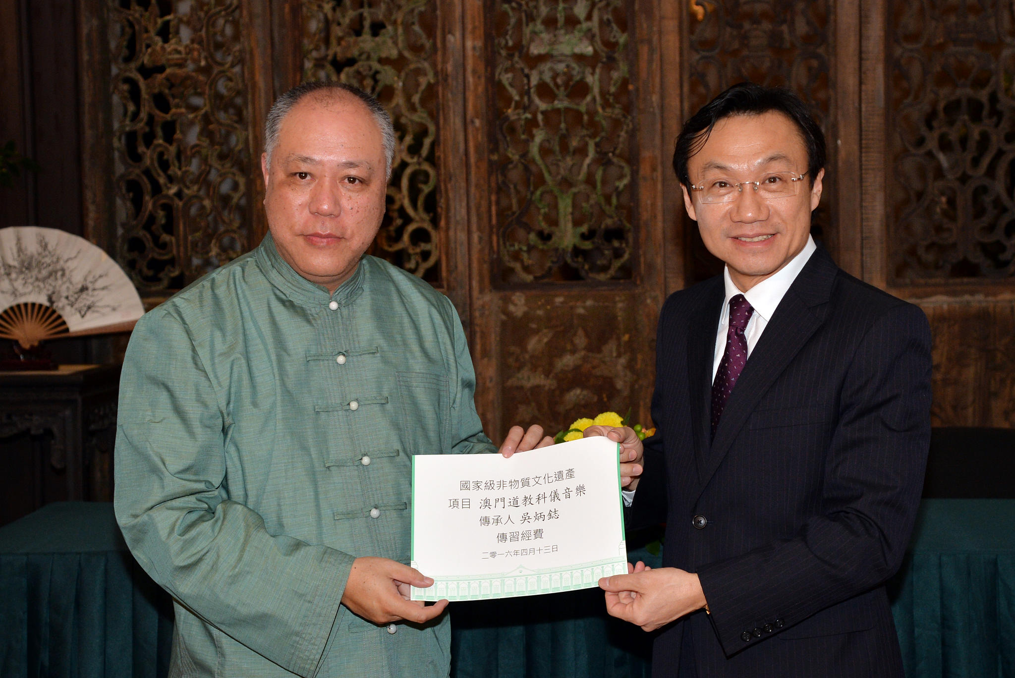O Ministério da Cultura da RPC e a Secretaria para os Assuntos Sociais e Cultura do Governo da RAEM organizaram, no dia 13 de Abril, pelas 16:30 horas, na Casa do Mandarim, a Cerimónia de Assinatura do “Plano de Execução de Intercâmbio Cultural e de Cooperação entre a China Continental e a RAEM 2016-2018” e a Cerimónia de Distribuição de Verbas aos Herdeiros Representativos do Património Cultural Intangível a Nível Nacional.