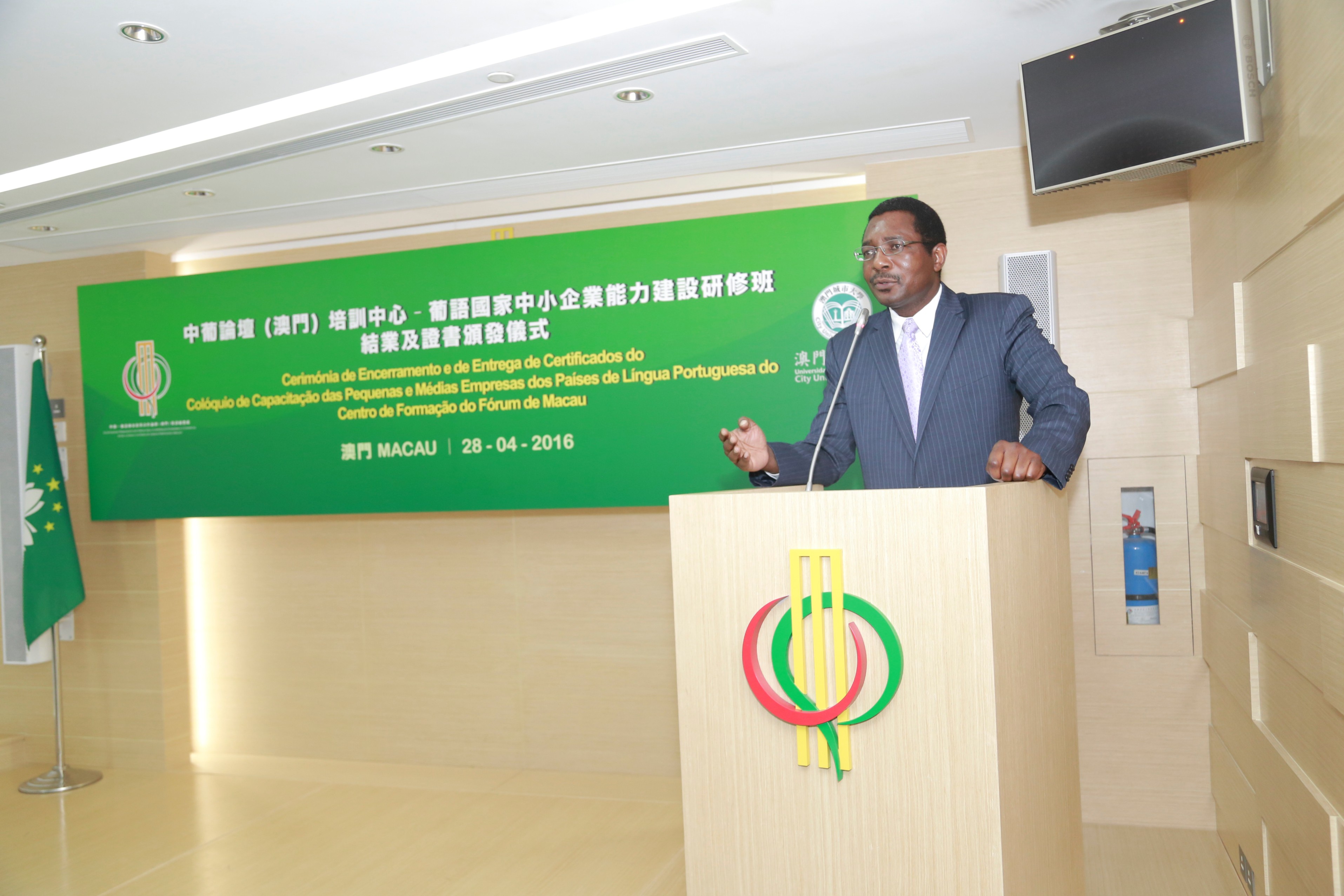 Realizou-se no dia 28 de Abril, no Secretariado Permanente do Fórum para a Cooperação Económica e Comercial entre a China e os Países de Língua Portuguesa (Macau), a “Cerimónia de Encerramento do Colóquio de Capacitação das Pequenas e Médias Empresas dos Países de Língua Portuguesa” do Centro de Formação do Fórum de Macau, ministrado pela Universidade da Cidade de Macau.