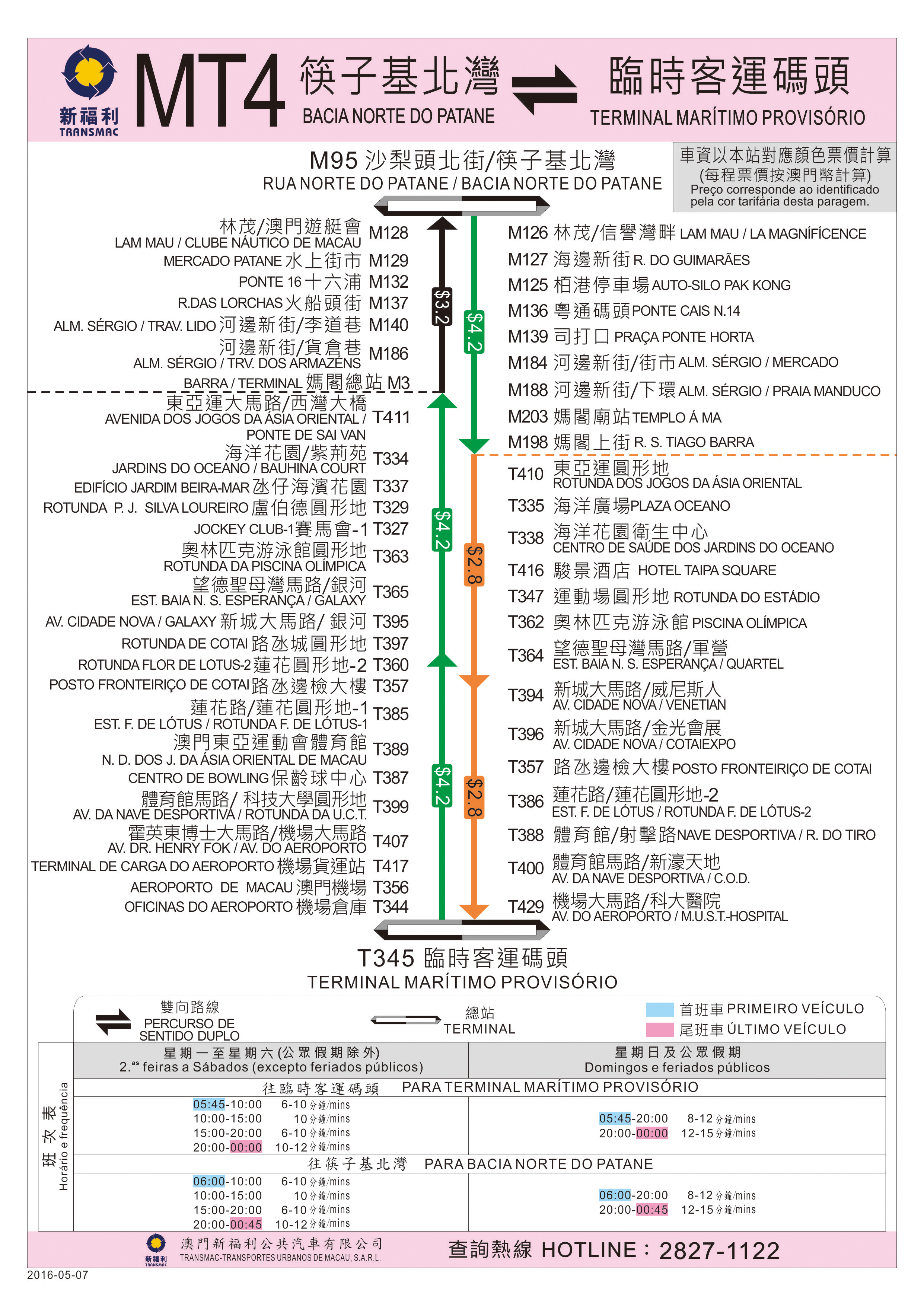 Em simultâneo, devido ao alargamento da área de serviço, o itinerário da carreira n.º MT4 será ajustado. Na ida (em direcção a Terminal Marítimo Provisório) depois de partir da “Rua Note do Patane / Bacia Norte do Patane”, faz escala nas seguintes paragens adicionais: “Lam Mau / La Magníficence”, “R. do Guimarães”, “Auto-silo Pak Kong”, “Ponte Cais n.º 14”, “Alm. Sérgio / Mercado” e “Alm. Sérgio / Praia Manduco” e volta em seguida ao percurso antigo, sem fazer escala na paragem “Torre / Túnel Rodoviários”. Por outro lado, na volta (em direcção à Rua Norte do Patane / Bacia Norte do Patane), parte do “Terminal Marítimo Provisório” e faz escala nas seguintes paragens adicionais: “Oficinais do Aeroporto”, “Aeroporto de Macau”, “Terminal de Carga do Aeroporto”, “Alm. Sérgio / Trv. dos Armazéns”, “Alm. Sérgio / Trav. Lido”, “Rua das Lorchas”, “Ponte 16”, “Mercado Patane” e “Lam Mau / Clube Náutico de Macau”, sem fazer escala na “Torre de Macau”. Além disso, o horário desta carreira passa das 6h00 às 24h00 para das 5h45 às 00h45, a fim de dar resposta à necessidade do público.