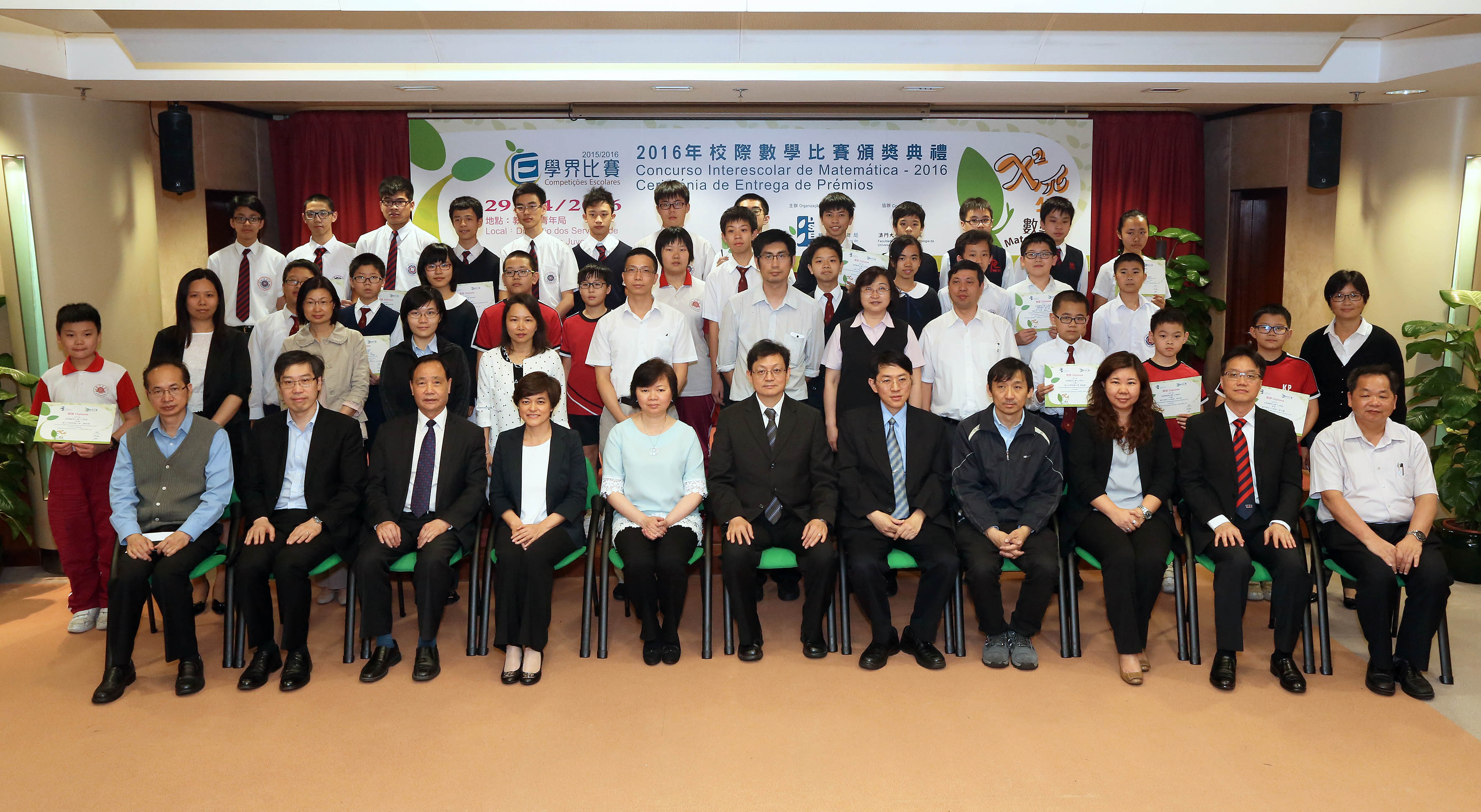A Direcção dos Serviços de Educação e Juventude (DSEJ), em colaboração com a Faculdade de Ciências e Tecnologia da Universidade de Macau organizou, com êxito, o Concurso Interescolar de Matemática 2016 e realizou, no dia 29 de Abril, a cerimónia de entrega de prémios, na qual estiveram presentes os seguintes convidados: o subdirector, Lou Pak Sang, o subdirector da Faculdade de Ciências e Tecnologia da Universidade de Macau, Wong Pak Kin, o professor auxiliar, Leong Ieng Tak e os directores de várias escolas dos ensinos primário e secundário. Ambas as instituições pretenderam, através deste concurso, promover o espírito de investigação e aprendizagem da matemática dos alunos, melhorar as suas capacidades nesta disciplina e aproveitar a oportunidade para sinalizar os alunos, dos ensinos primário, secundário geral e secundário complementar, com potencialidades para participarem nos concursos de matemática regionais e internacionais e, em simultâneo, reforçar o intercâmbio neste âmbito com os alunos de outras regiões, ampliando, também, os seus horizontes.