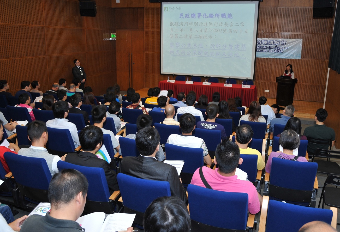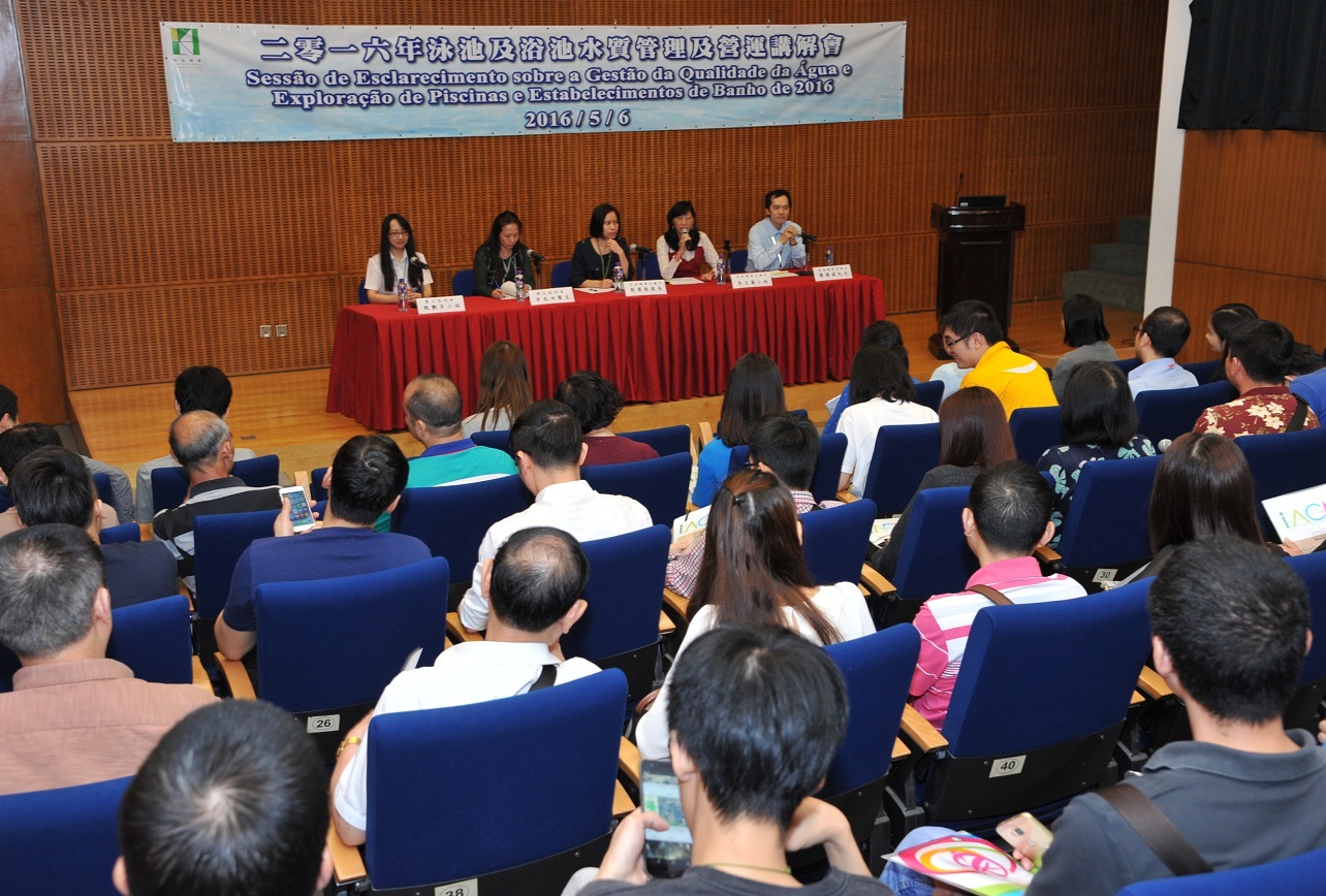 A sessão de esclarecimento teve lugar no dia 6 de Maio, às 10:00 horas, no auditório do Museu de Arte de Macau. Na sessão, o pessoal do Laboratório do IACM fez uma apresentação das normas relativas à gestão da qualidade das águas e exploração de piscinas e estabelecimentos de banho, incluindo os trabalhos de fiscalização e inspecção à qualidade das águas a realizar pelo Laboratório do IACM; normas sobre a gestão de sua exploração; exigências dos parâmetros químicos e gerais do local; exigências dos parâmetros microbiológicos; utilização dos instrumentos de medição, de acordo com os parâmetros locais; controlo da qualidade dos resultados da inspecção local; plano de incentivo, no domínio do controlo e fiscalização da qualidade das águas; e problemas frequentes verificados na qualidade das águas. Em relação à inspecção microbiológica, foram apresentados os itens, limites e objectivos da inspecção microbiológica e, ainda, o método e observações a considerar nessa inspecção. De acordo com os dados do Laboratório do IACM, a taxa de aprovação nos parâmetros dos indicadores microbiológicos de todas as piscinas de Macau no ano passado foi de 93,9%, registando-se uma ligeira descida em relação ao ano anterior. Por sua vez, a taxa dos estabelecimentos balneares situou-se nos 92,8%, representando uma ligeira subida em relação ao ano anterior.