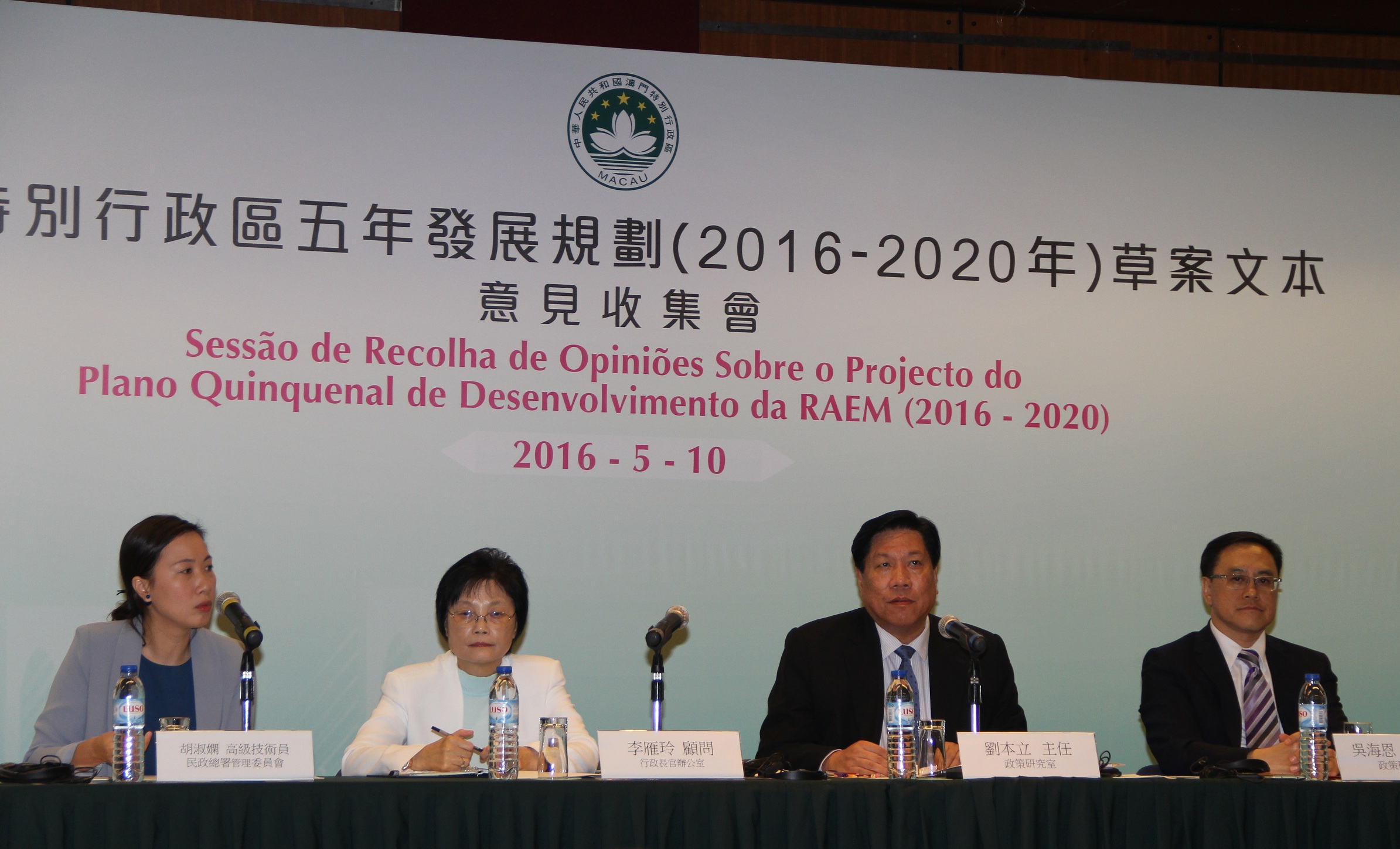 Os presentes apresentaram, dinamicamente, diversas opiniões e sugestões construtivas em prol do melhoramento do projecto do Plano Quinquenal, das quais se destacam a promoção da renovação urbana da zona norte, o Plano pormenor da Zona A dos novos aterros, a flexibilização dos requisitos para a reconstrução dos edifícios, o aumento da capacidade de tratamento das águas residuais, o desenvolvimento da inovação tecnológica, as deslocações inteligentes, a construção do complexo de cuidados de saúde das Ilhas, o planeamento geral das políticas de saúde, o desenvolvimento equilibrado do serviço de prestação de saúde público e privado, a passagem da velhice na zona de antiga residência, as oportunidades de emprego para as pessoas da terceira idade, a promoção das políticas favoráveis às famílias, a optimização do papel dos órgãos consultivos do governo, a utilização de métodos concisos para fortalecer a promoção e divulgação do projecto, a promoção dos templos e festivais culturais, a promoção da aprendizagem do Português, entre outros. No decorrer da sessão, houve opiniões que transpareceram a preocupação de que o atraso na publicação do projecto oficial poderá afectar o resultado de execução do Plano e que o planeamento do futuro desenvolvimento de Coloane, a reavaliação da construção do metro ligeiro, o planeamento geral do transporte da zona norte, a igualdade de género, a economia marítima, entre outros aspectos, são questões que merecem uma profunda reflexão e aperfeiçoamento.