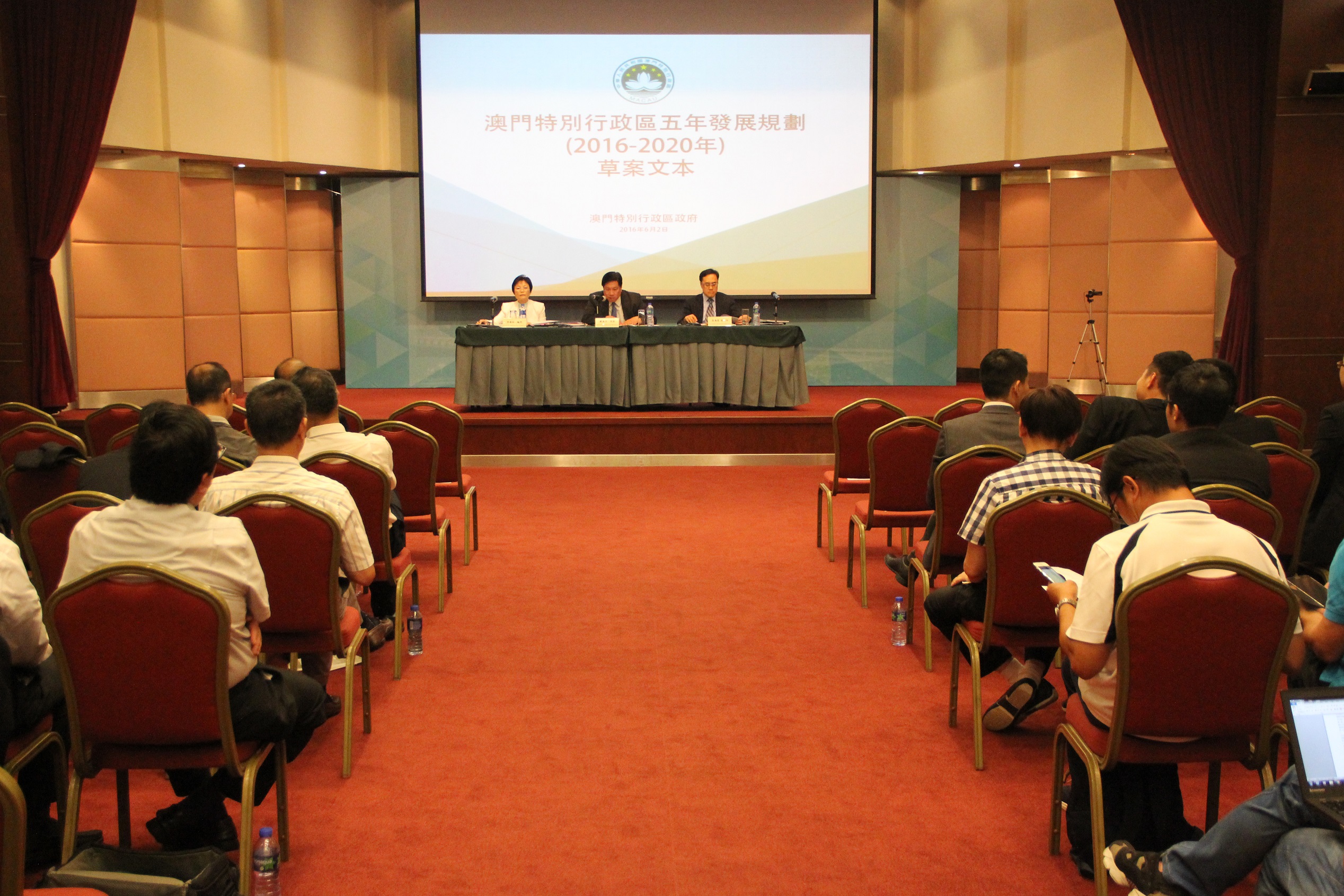 O projecto do Plano Quinquenal de Desenvolvimento da Região Administrativa Especial de Macau (2016-2020) foi divulgado no passado dia 26 de Abril, tendo assim iniciado os trabalhos da recolha de opiniões, com a duração de 2meses. Neste contexto, o Gabinete de Estudos das Políticas, entidade responsável pelos trabalhos da presente recolha de opiniões, realizou hoje (dia 2 de Junho), na Sala Flor de Lótus do 5.° andar do Edifício World Trade Centre, a sessão de recolha de opiniões destinada às comissões da área do Secretário para os Transportes e Obras Públicas. O coordenador do Gabinete de Estudos das Políticas e o seu adjunto, Lau Pun Lap e Ng Hoi Ien, respectivamente, bem com a assessora do Gabinete do Chefe do Executivo, Lei Ngan Leng, compareceram na sessão e auscultaram as opiniões dos participantes.