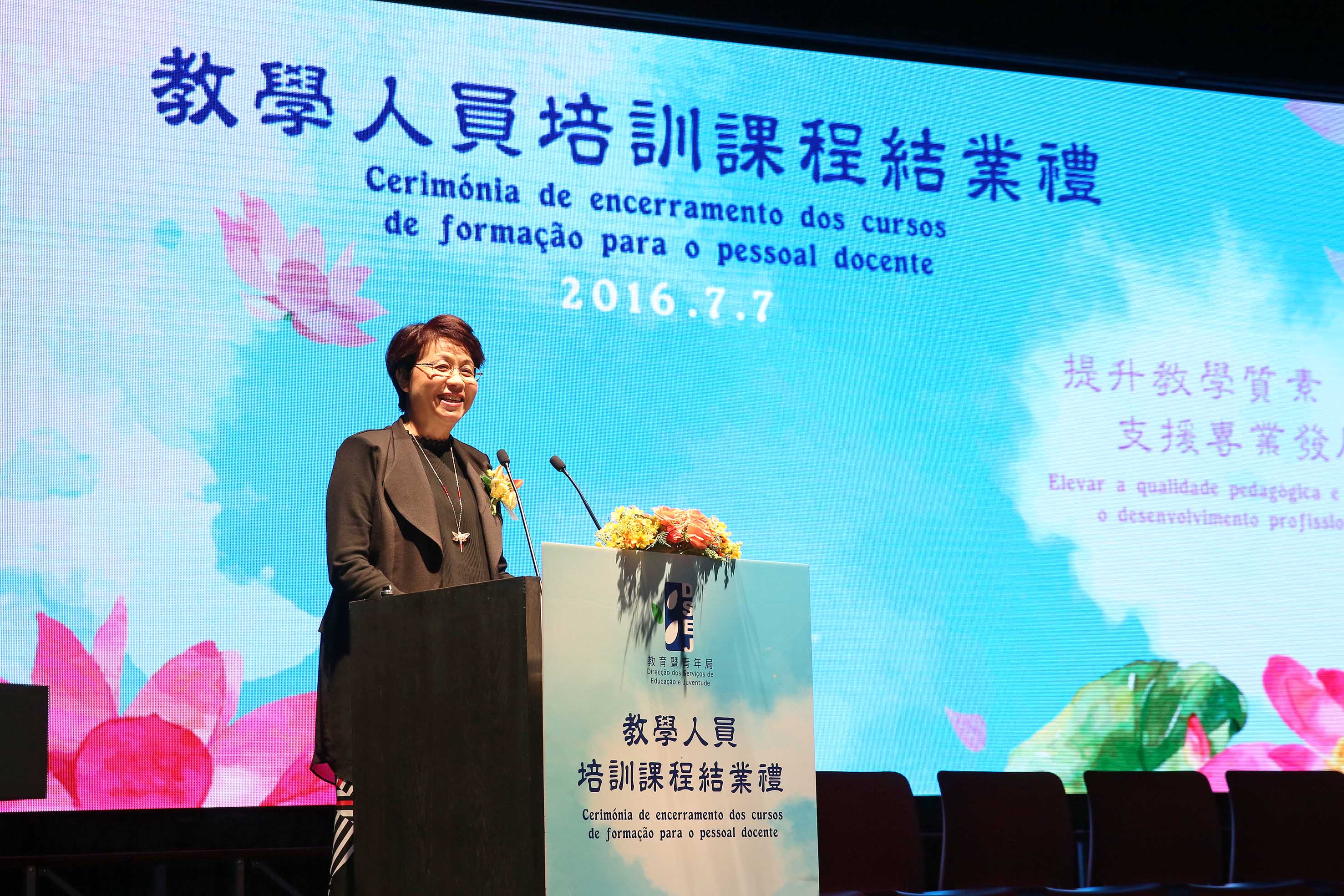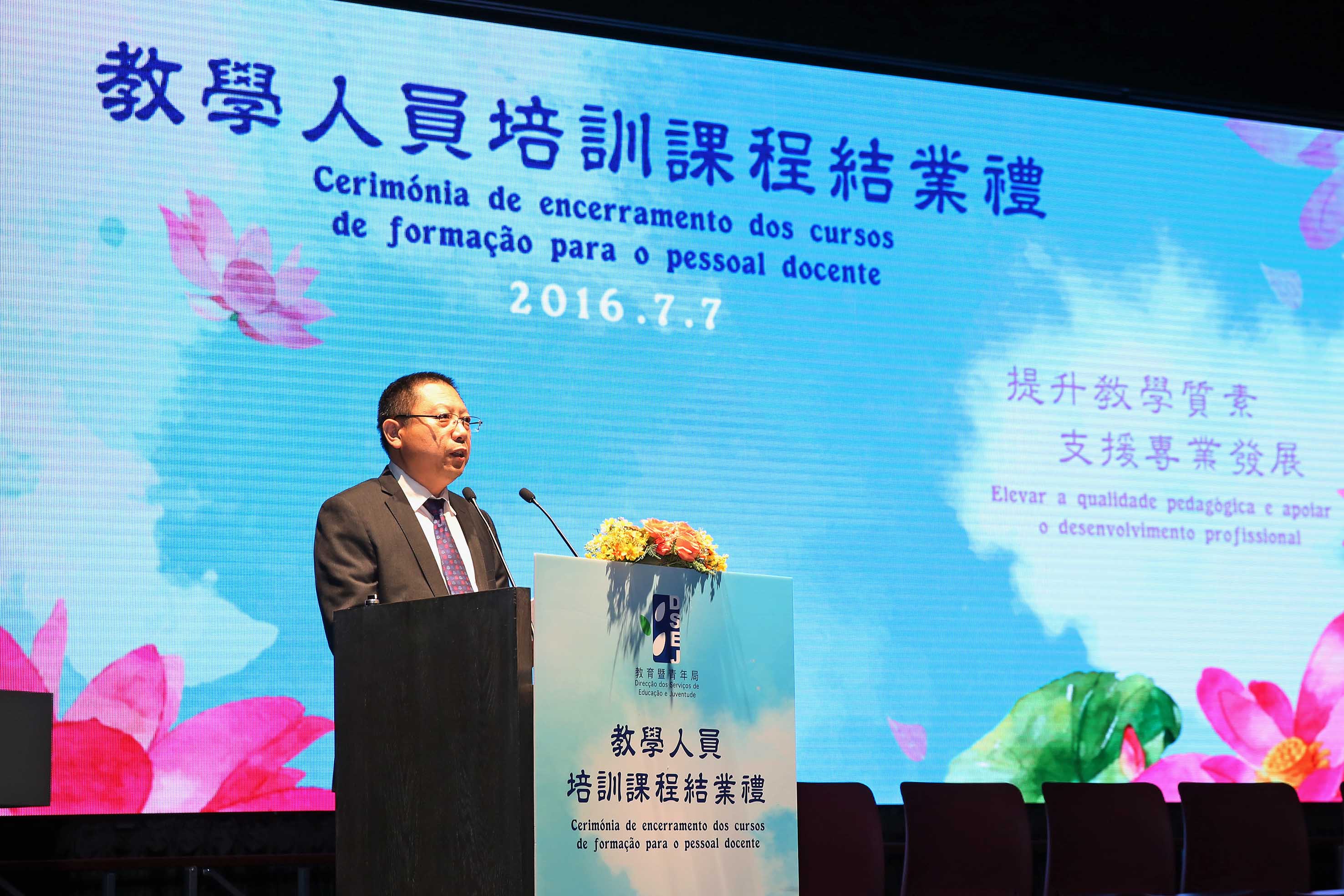 Para partilhar com o pessoal docente os bons resultados e a satisfação alcançada após a conclusão destes cursos e, ao mesmo tempo, incentivar estes profissionais a continuarem os estudos para assim contribuírem para o melhoramento constante da qualidade da educação, a DSEJ realizou a “Cerimónia de encerramento dos cursos de formação para o pessoal docente do ano lectivo de 2015/2016” na tarde do dia 7 de Julho, no Auditório da Escola São Paulo. A referida cerimónia contou com a presença dos seguintes convidados: o Senhor Secretário para os Assuntos Sociais e Cultura, Alexis, Tam Chon Weng, o chefe do Gabinete do Secretário para os Assuntos Sociais e Cultura, Ip Peng Kin, a directora da DSEJ, Leong Lai, o subchefe do Departamento de Cultura e Educação do Gabinete de Ligação do Governo Popular Central na RAEM, Pu Hailong, o assessor do Gabinete do Secretário para os Assuntos Sociais e Cultura, Wai Cheng Iong, os subdirectores da DSEJ, Lou Pak Sang e Kuok Sio Lai, o chefe de secção do Gabinete para os Assuntos de Hong Kong, Macau e Taiwan do Ministério da Educação, Zhang Jun, o director da Faculdade de Educação da Universidade de Macau, Fan Xitao, a directora substituta da Escola Superior de Línguas e Tradução do Instituto Politécnico de Macau, Cui Mingfen, a directora do Departamento de Português da Faculdade de Letras da Universidade de Macau, Maria Fernanda Gil Costa, a presidente da Associação de Educação de Macau, Ho Sio Kam e o presidente da Associação das Escolas Católicas de Macau, Chow Pak Fai, bem como os representantes e formadores das instituições de formação, os directores escolares e mais de 600 docentes que participaram nos cursos.