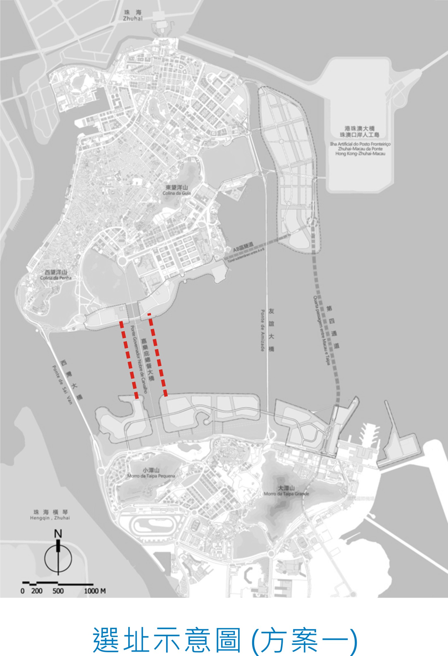 Tendo em consideração de que nesse lugar a distância do mar entre a península de Macau e a ilha da Taipa é mais curta e evitando impactos na Ponte General Nobre de Carvalho e nas paisagens das zonas circundantes, após um estudo preliminar, a DSSOPT acha que é adequada a construção de túneis subaquáticos ao lado da Ponte. Estes túneis ligarão as Zonas C e D dos Novos Aterros Urbanos da Taipa à Zona B dos Novos Aterros Urbanos de Macau. Segundo a estimativa preliminar, cada túnel terá 1 200 metros de comprimento, isto é, metade do comprimento da Ponte General Nobre de Carvalho, e terá, pelo menos, duas faixas de rodagem de sentido único. Um túnel vai em direcção a Macau e outro à Taipa. Há três propostas em relação ao local onde se construirão os túneis, designadamente, nos dois lados da Ponte, no lado oeste da Ponte ou no lado leste da Ponte.
