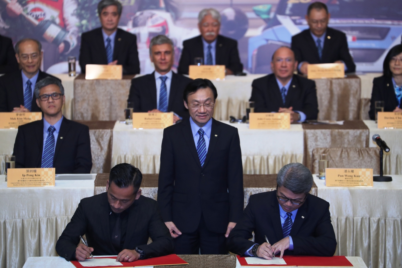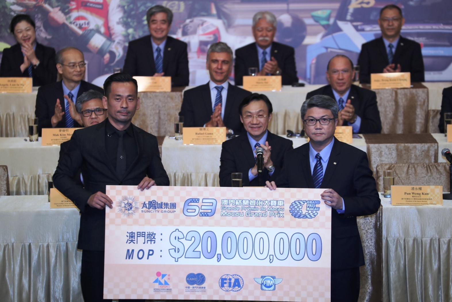 Durante a cerimónia, Sr. Pun Weng Kun, Presidente do Instituto do Desporto do Governo da RAEM e Sr. Alvin Chau, Director Executivo e Presidente do Suncity Grupo, marcou a assinatura do acordo do Título de Patrocínio com a apresentação do cheque gigante. O evento deste ano é oficialmente designado por Suncity Grupo 63º Grande Prémio de Macau.