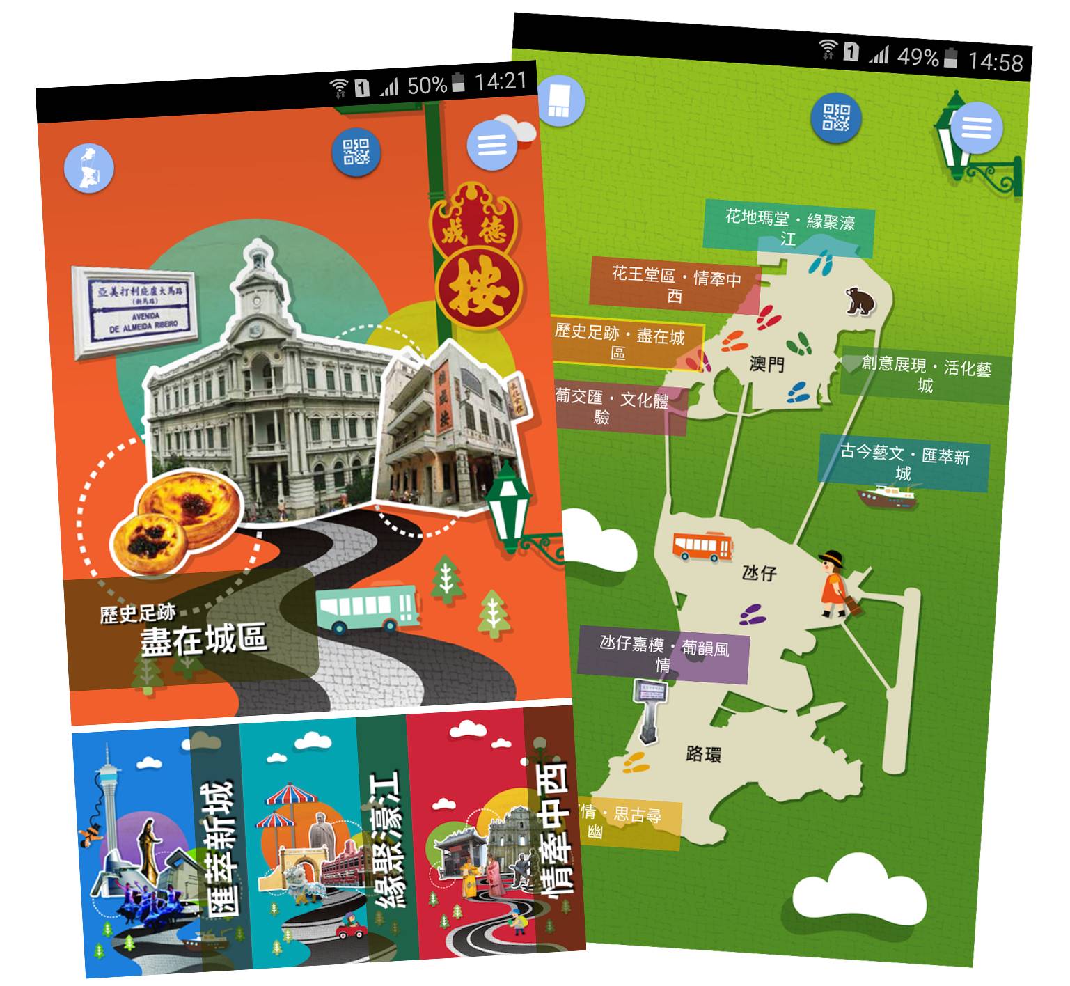 Disponível em chinês (tradicional e simplificado), inglês e português, a aplicação inclui mapas dos oito roteiros, descrições dos pontos turísticos, incluindo do Centro Histórico de Macau inscrito pela UNESCO, espectáculos culturais de rua agendados, restaurantes, carreiras de autocarros, Wi-Fi, casas de banho públicas, e outras informações úteis, ao longo dos roteiros. Os utilizadores também podem fazer o scan de código QR em placas de sinalização ao longo dos roteiros para obter as informações turísticas mesmo offline.