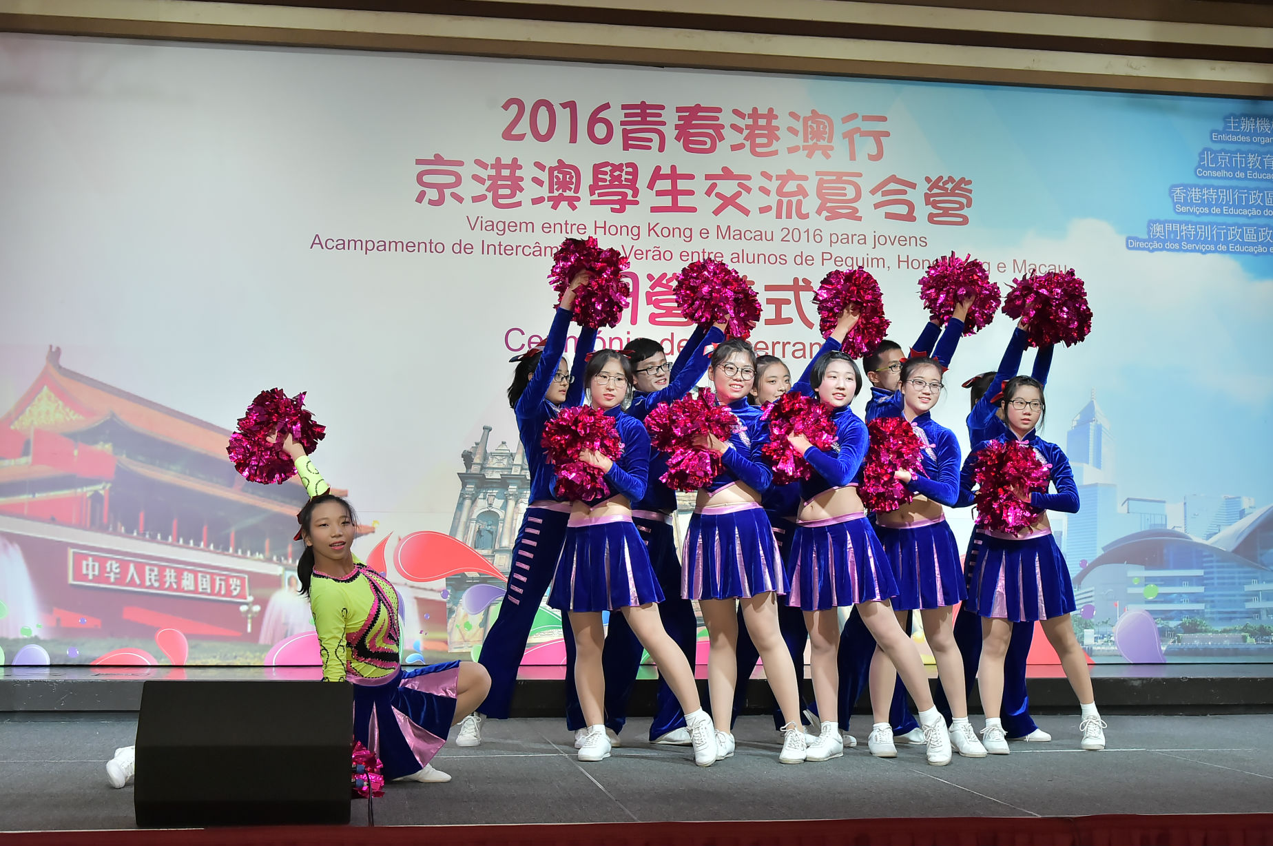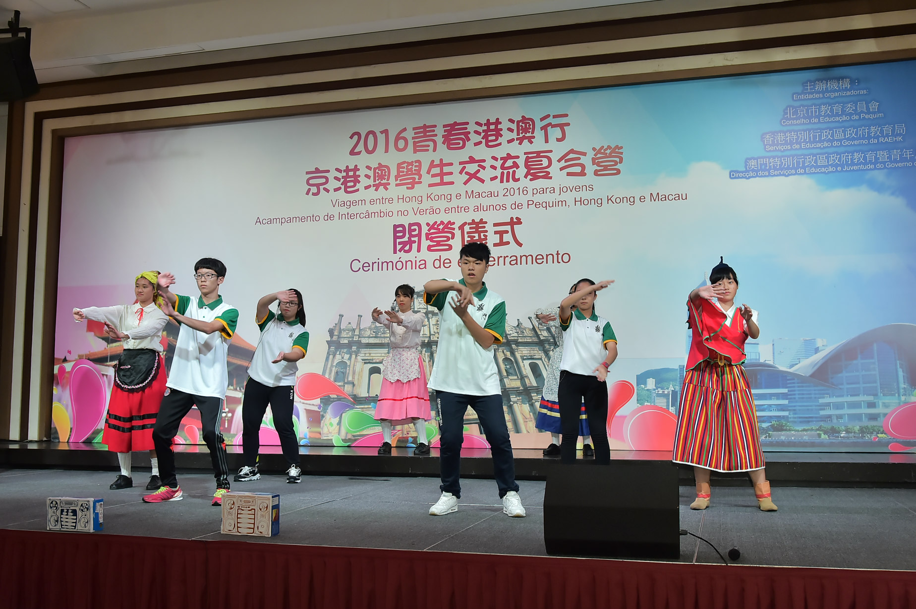 A cerimónia de encerramento do acampamento realizou-se no dia 28 de Julho no Centro de Convenções e Entretenimento da Torre de Macau, e contou com a presença dos seguintes convidados: a chefe do Departamento de Ensino da DSEJ, Leong Vai Kei, o subchefe da divisão de educação do Departamento de Cultura e Educação do Gabinete de Ligação do Governo Popular Central na RAEM, Xin Jianbo, o subchefe do Gabinete para os Assuntos dos Compatriotas de Hong Kong, Macau e Taiwan do Conselho de Educação de Pequim, Wang Dewen, a secretária-geral adjunta principal dos Serviços de Educação da RAEHK, Li Mei Fun e a chefe da Secção de Recursos e Serviços para os Estudantes do Gabinete de Assuntos dos Estudantes da Universidade de Macau, Chau Kwai Chee. Os representantes dos alunos das três regiões referiram, no seu discurso na cerimónia de encerramento, que durante a participação neste acampamento tiveram a oportunidade de realizar um intercâmbio com os alunos das outras cidades, partilharam as suas experiências de vida e atitude de aprendizagem e deram a conhecer diferentes modos de vida, acrescentado que ampliaram os seus horizontes, aprofundaram o conhecimento sobre a cultura das três regiões, assim como estabeleceram laços de amizade profundos. Para além disso, os alunos das três regiões participaram, em conjunto, na peça teatral “Conjugação de dança e artes marciais”, dança tradicional chinesa e canto de música, entre outros eventos, e ainda exibiram os seus talentos representando diferentes características culturais das três regiões. Por fim, os docentes e alunos de Pequim, Hong Kong e Macau participaram na dança “Maçã pequena”, criando um ambiente de entusiasmo. O acampamento terminou com grande sucesso numa atmosfera comovente e fervorosa.