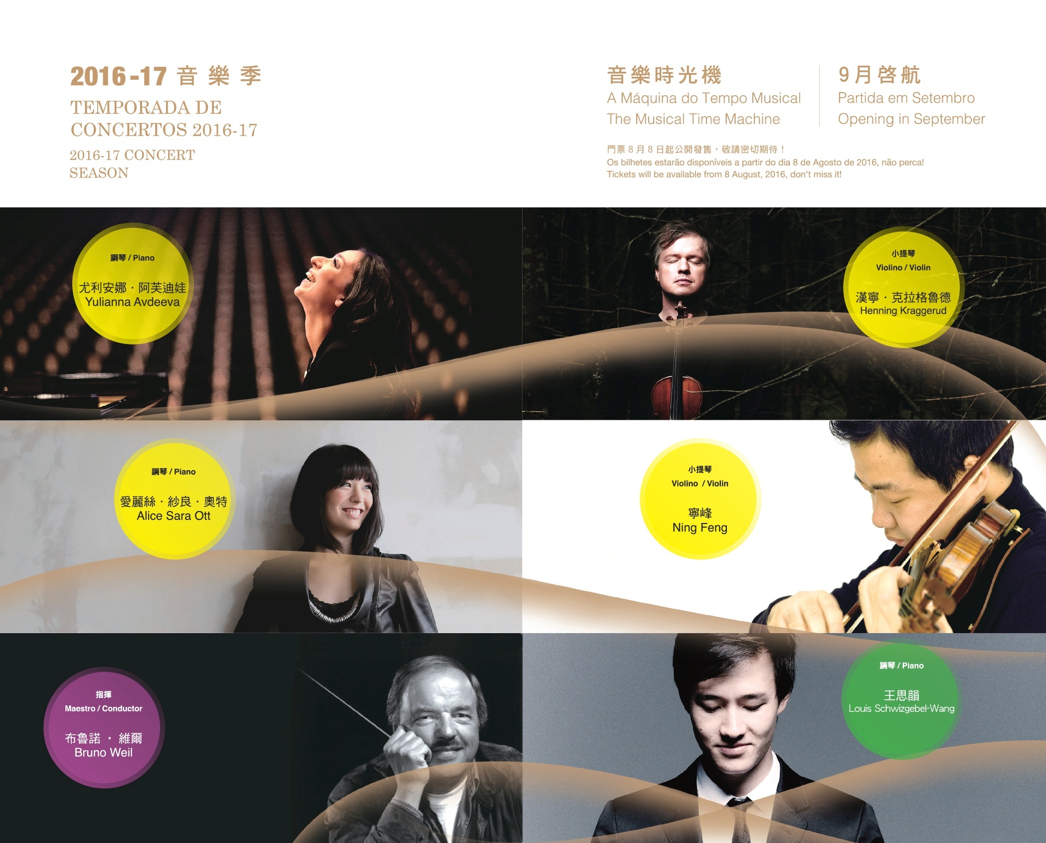 A Orquestra de Macau (OM), sob a égide do Instituto Cultural (IC), irá dar início à sua Temporada de Concertos 2016-2017 em Setembro. Nesta temporada de concertos, subordinada ao tema “O Vosso Tempo com a Música”, vários talentos promissores da música clássica são convidados para apresentar a efervescência juvenil da música clássica. Os espectadores podem, através das diversas actuações, sentir a perseverança e o zelo dos músicos e constatar como estes passam o seu tempo com a música, sendo absorvidos pela sua própria música. Os bilhetes encontram-se à venda a partir do dia 8 de Agosto, Segunda-feira, na Bilheteira Online de Macau.