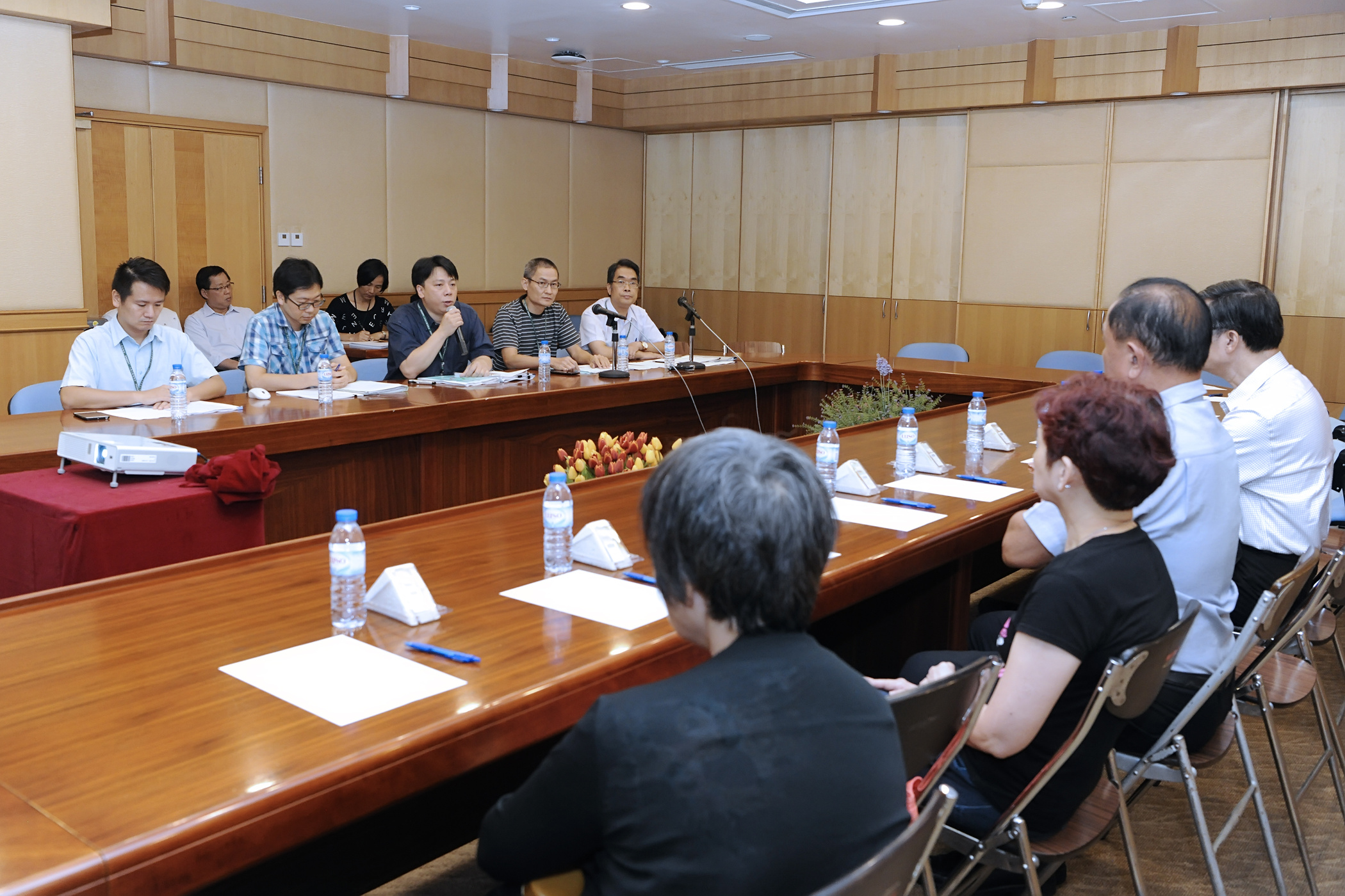 O Chefe da Divisão da Fiscalização do Departamento de Urbanização da DSSOPT, Lau Koc Kun, e vários engenheiros responsáveis pela vistoria dos edifícios estiveram presentes na sessão para explicar o estado da estrutura do edifício em causa.