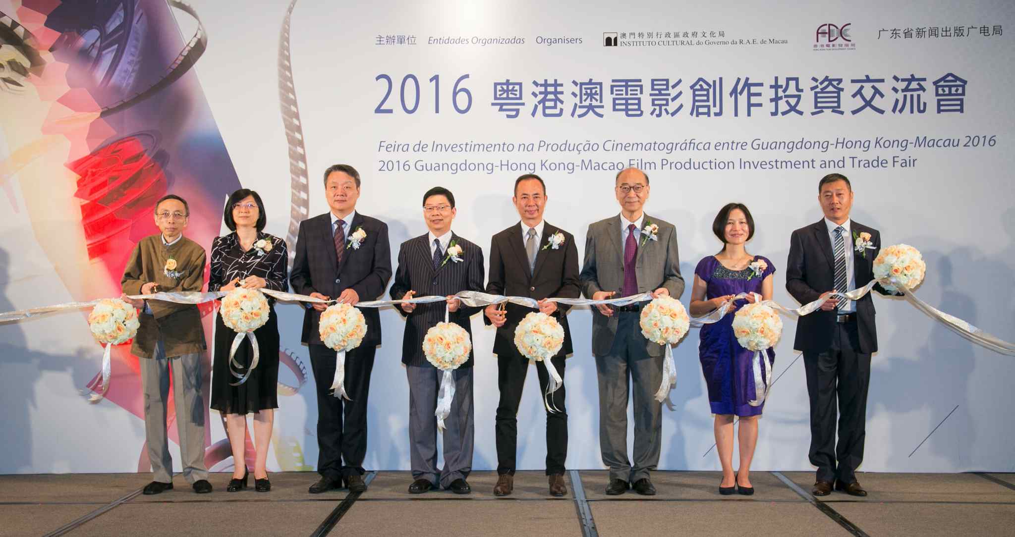 Co-organizada pelo Instituto Cultural (IC), pelo Hong Kong Film Development Council e pela Administração de Imprensa e Publicação, Rádio, Cinema e Televisão da Província de Guangdong, a “Feira de Investimento na Produção Cinematográfica entre Guangdong-Hong Kong-Macau 2016” (“Feira de Investimento”) tem lugar nos dias 16 e 17 de Agosto de 2016 no Regency Hotel de Macau. A Feira reúne investidores e produtores de cinema das três regiões, visando proporcionar combinações de negócios, oportunidades de investimento e o desenvolvimento de projectos cinematográficos. A cerimónia de abertura da “Feira de Investimento” realizou-se às 10:00 horas do dia 16 de Agosto de 2016 (Terça-feira), a qual foi oficiada pelo Presidente do Instituto Cultural do Governo da R.A.E. de Macau, Ung Vai Meng; pelo Vice-Director da Administração de Imprensa e Publicação, Rádio, Cinema e Televisão da Província de Guangdong, Liu Xiaoyi; pelo Chefe Assistente do Create Hong Kong, Wellington Fung; pelo Assistente do Director-Geral do Departamento de Cultura e Educação do Gabinete de Ligação do Governo Popular Central na R.A.E. de Macau, Shao Bin; pela Vice-Presidente do Conselho para as Indústrias Culturais do Governo da R.A.E. de Macau, Hsu Hsiu-Chu; pelo membro do Conselho de Administração do Fundo das Indústrias Culturais do Governo da R.A.E. de Macau, Chu Miu Lai; pelo Chefe do Gabinete de Gestão de Cinema da Administração de Imprensa e Publicação, Rádio, Cinema e Televisão da Província de Guangdong, Chen Song e pelo Secretário-Geral da Associação da Indústria Cinematográfica de Guangdong, Zheng Dawei.