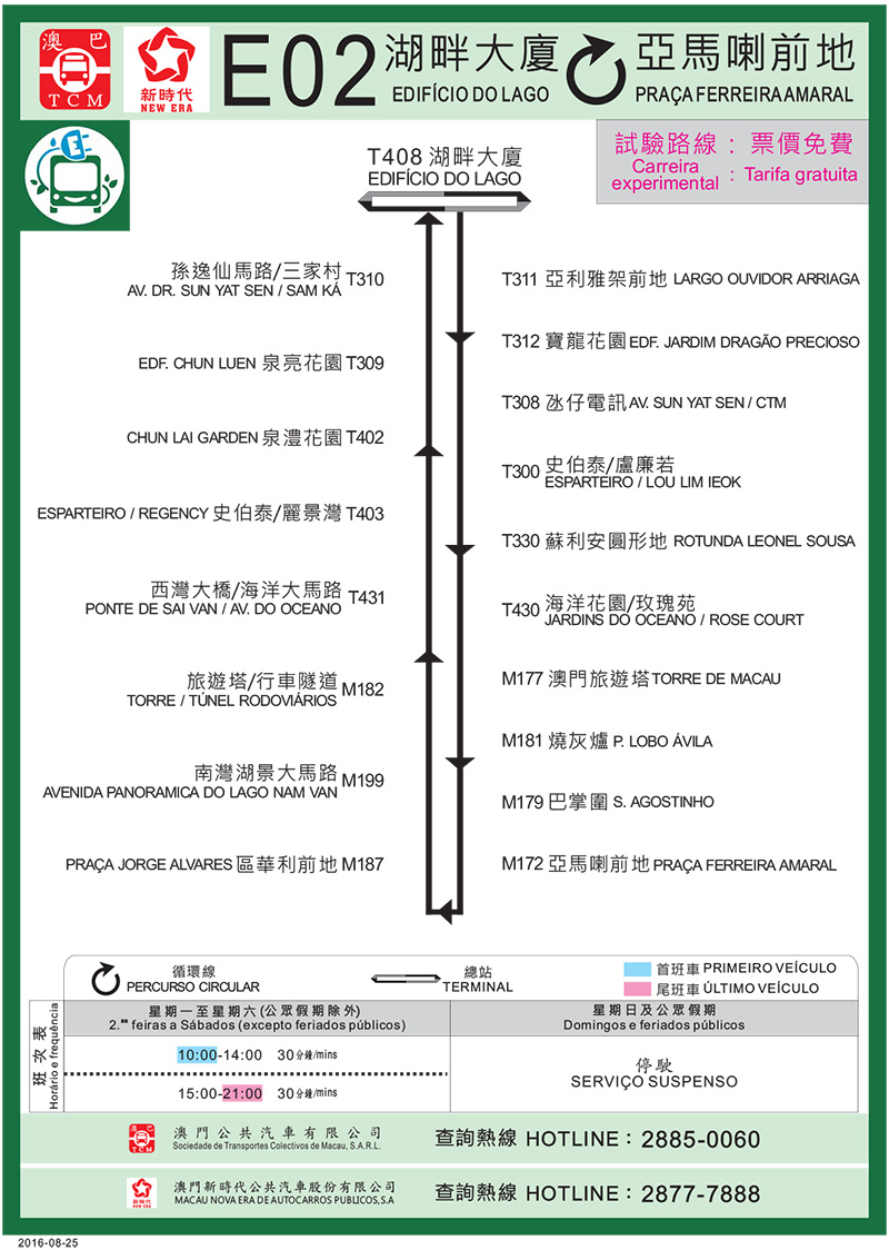 A carreira experimental E02 oferece serviço gratuito de segunda-feira a sábado (excepto feriados), das 10h00 às 14h00 e das 15h00 às 21h00, com partida de cada 30 minutos. É previsto que o teste dura 30 dias, podendo ser prolongado segundo o resultado. Período entre qual, questionários estão disponíveis na página da DSAT www.dsat.gov.mo, no terminal do Edifício do Lago e nos habitáculos dos autocarros eléctricos para os passageiros preencher com o objectivo de recolher os comentários dos passageiros acerca da aceitabilidade e grau de satisfação dos autocarros. Os comentários são muito bem-vindos.