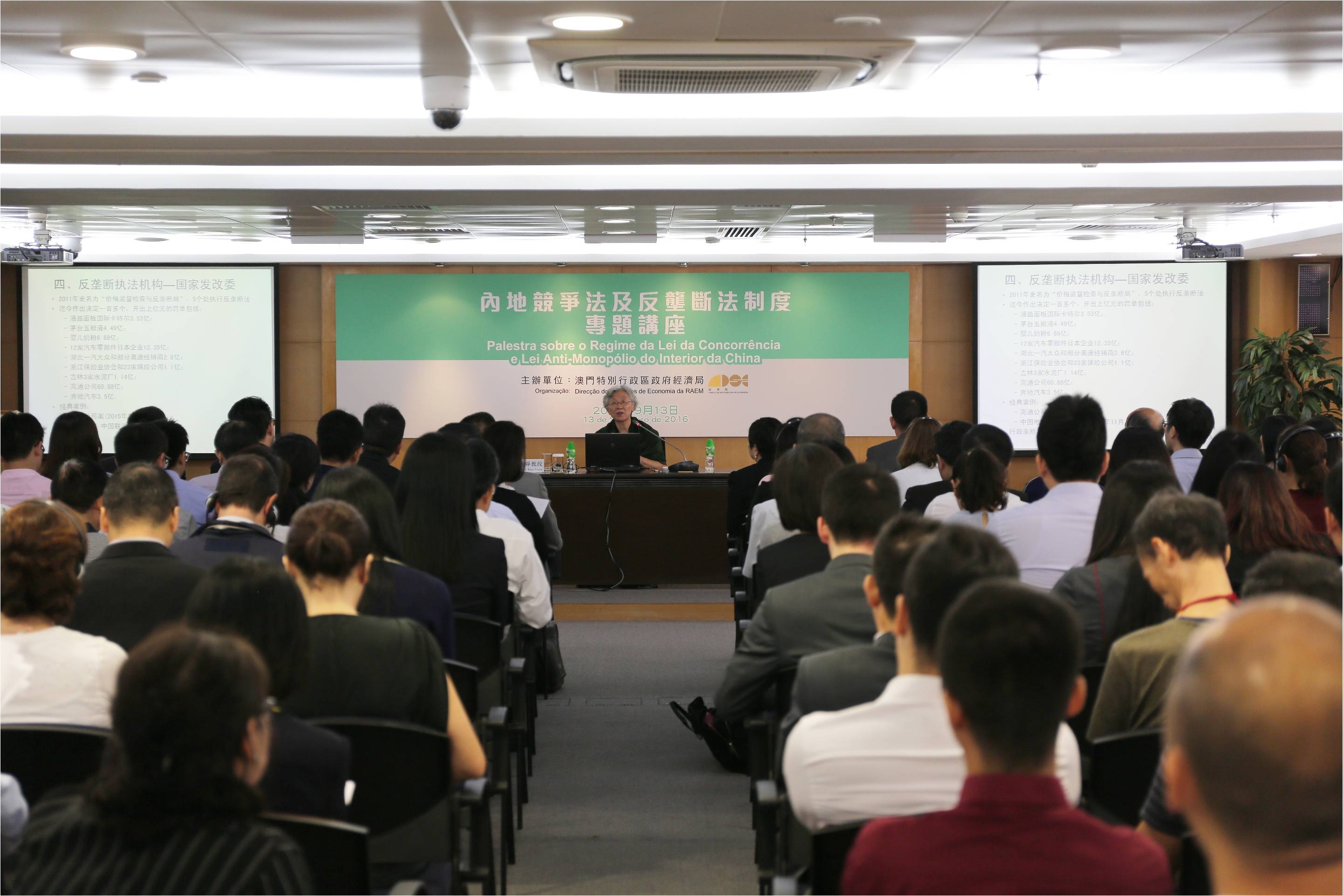 Para participar na Palestra, foram convidados dois académicos distintos, considerados autoridades do Interior da China na área da Lei da Concorrência e da Lei Anti-Monopólio, o Professor Wang Xiaoye, Doutor em Direito pela Universidade de Hamburgo, Alemanha, Investigador do Instituto de Estudos de Direito da Academia de Ciências Sociais da China, e o Dr. Li Honglei, Coordenador do Instituto de Direito Constitucional e Direito Administrativo da Academia de Ciências Sociais da China, que procederam à apresentação de vários temas relacionados com a Lei Anti-Monopólio do Interior da China, nomeadamente elaboração e aplicação, problemas enfrentados na sua aplicação e perspectivas do seu aperfeiçoamento, bem como mecanismos, medidas e resultados da implementação da lei da concorrência, perspectivas de evolução futura, entre outros. O Professor Wang Xiaoye considerou que a Lei Anti-Monopólio do Interior da China já se tornou uma das leis anti-monopólio com mais impacto no mundo, graças à reforma do sistema económico da China, a Lei Anti-Monopólio tem cada vez um papel mais importante no sistema jurídico da China. O Dr. Li Honglei referiu que a Lei da Concorrência do Interior da China se encontra, de momento, a ser revista, visando reforçar a Lei e harmonizar-se com outras legislações.