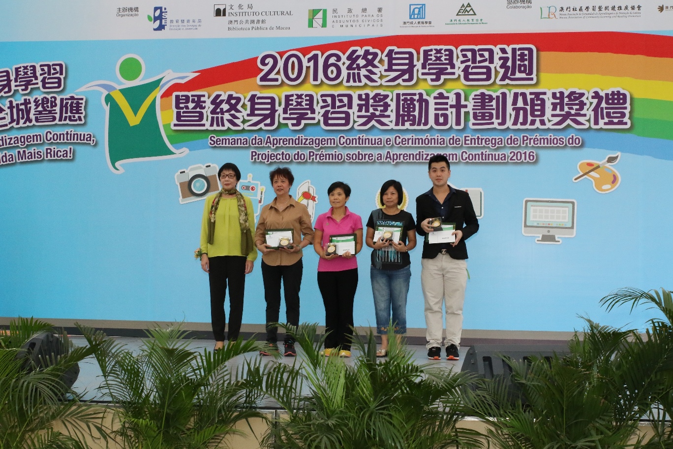 A Cerimónia de Entrega de Prémios do Projecto do Prémio sobre a Aprendizagem Contínua 2016” teve lugar na Praça da Amizade, no dia 15 de Outubro (sábado), entre as 16:00 e 18:00 horas. Os convidados participantes nesta cerimónia incluíram a subdirectora da DSEJ, Kuok Sio Lai, chefe do Departamento de Ensino da DSEJ, Leong Vai Kei, chefe de Departamento de Gestão de Bibliotecas Públicas do Instituto Cultural, Tang Mei Lin, chefe da Divisão de Formação e Documentação dos Serviços de Apoio Administrativo do Instituto para os Assuntos Cívicos e Municipais, Vong Iun Han, chefe da Divisão de Extensão Educativa da DSEJ, Kong Ngai, presidente da Direcção da Associação de Educação Permanente de Macau, Choi Weng Tat e secretário-geral da Direcção da Associação de Educação de Adultos de Macau, Wong Vai Kit, Nelson, representantes das instituições que já foram associadas ao “Projecto do Prémio sobre a Aprendizagem Contínua” e ainda os representantes das novas instituições associadas este ano. Os convidados distribuíram os prémios aos cidadãos contemplados que partilharam as suas experiências de aprendizagem, permitindo aos participantes testemunharem os frutos obtidos. Durante a actividade, foi realizada uma cerimónia dedicada à adesão das instituições associadas ao “Projecto do Prémio sobre a Aprendizagem Contínua”. Além disso, foram ainda organizados espectáculos de palco, bem como jogos sob o tema da aprendizagem contínua e workshops ao ar livre, que atraíram a participação de grande número de cidadãos.