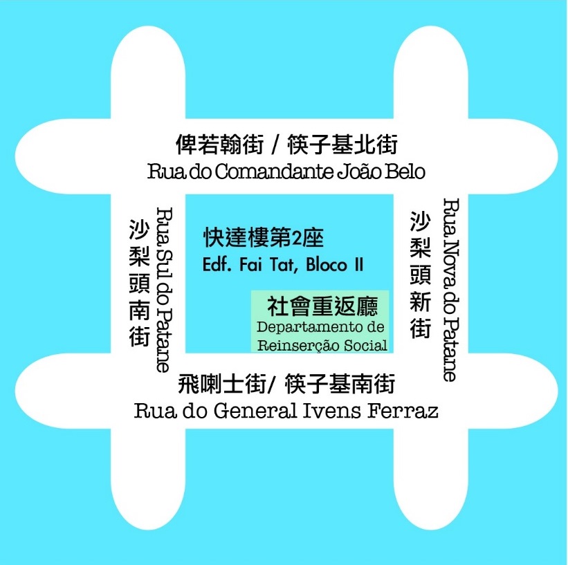 A partir do próximo dia 29 de Outubro de 2016, o Departamento de Reinserção Social (DRS) do Instituto de Acção Social (IAS) passará a funcionar na Rua do General Ivens Ferraz, Edifício Fai Tat, Bloco II, 1.° andar-B, da Habitação Social do Fai Chi Kei, Macau, mantendo-se inalterados os números de telefone (28594946/28594202) e de fax (28523925).