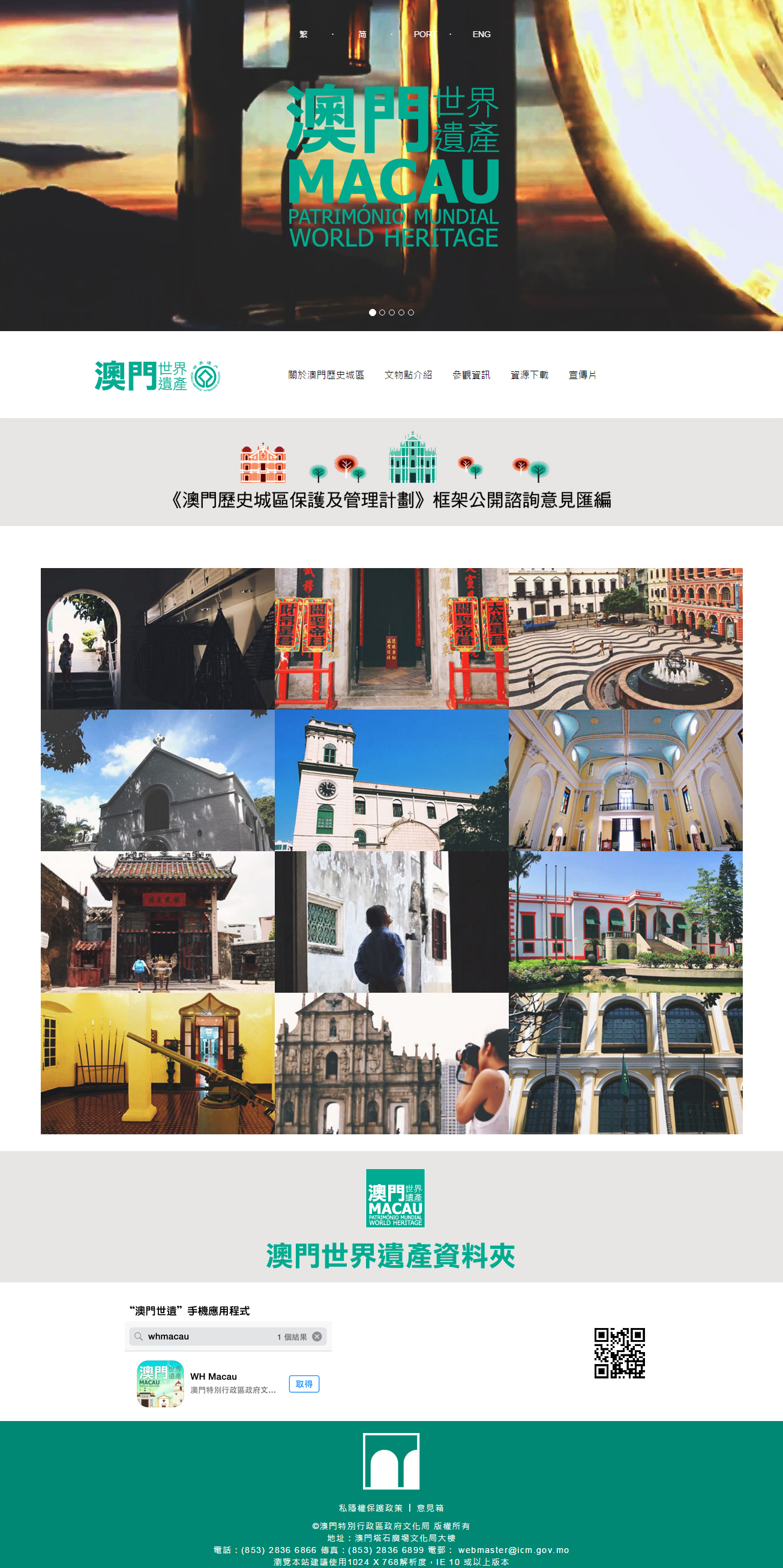 A página do “Património Cultural” (www.culturalheritage.mo) irá substituir a página do património de Macau (www.macauheritage.net), passando a ser aquela uma plataforma para divulgação de notícias e de dados sobre o património cultural pelo IC. A página abarca património imóvel classificado e património intangível, oferecendo não só notícias diárias como também políticas legais, orientações e informações de consulta pública, entre outros. Do mesmo modo, a página do “Património Mundial de Macau” (www.wh.mo) foi também revista, permanecendo a sua URL inalterada, e passando esta a divulgar informações relacionadas com o “Centro Histórico de Macau”, classificado como património cultural mundial, e a promover a educação sobre o mesmo.