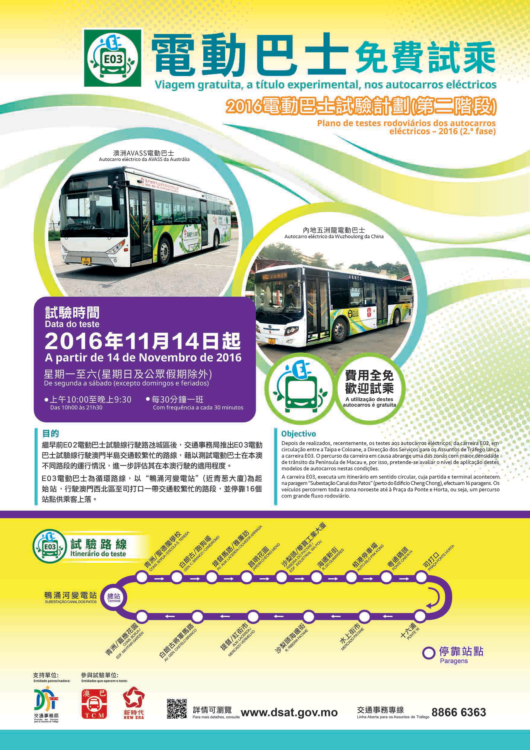 Após as negociações entre a Direcção dos Serviços para os Assuntos de Tráfego e as operadoras de autocarros, foi decidido lançar a nova carreira de autocarros eléctricos no próximo dia 14 de Novembro (segunda-feira), com o objectivo de avaliar o funcionamento destes veículos em diferentes vias. A nova carreira, designada por E03, cujo terminal se localiza na paragem “Subestação Canal dos Patos”, (perto do Edificio Cheng Chong), irá circular de forma gratuita ao público, neste período experimental, da zona noroeste até à Praça da Ponte e Horta, de segunda a sábado, excepto feriados.