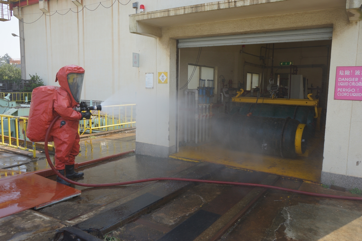 O exercício simulou a fuga no tubo da área de armazenagem de cloro na Central Térmica de Ká-Hó B. A Central Térmica de Ká-Hó accionou imediatamente as medidas de segurança, fechou todas as válvulas da tubagem, evacuou o respectivo pessoal para o local seguro de encontro, abordou rapidamente o incidente e as pessoas indispostas de acordo com o plano de contingência interno,e ligou para o CB. Durante o período, duas pessoas sentiram-se mal por terem inalado descuidadosamente o cloro perto da área de armazenagem de cloro. Após o alarme, esta Corporação enviou logo 7 veículos de emergência e 30 bombeiros ao local para executar a evacuação e lidar com o incidente conforme o plano definido. O simulacro durou cerca de 40 minutos.
