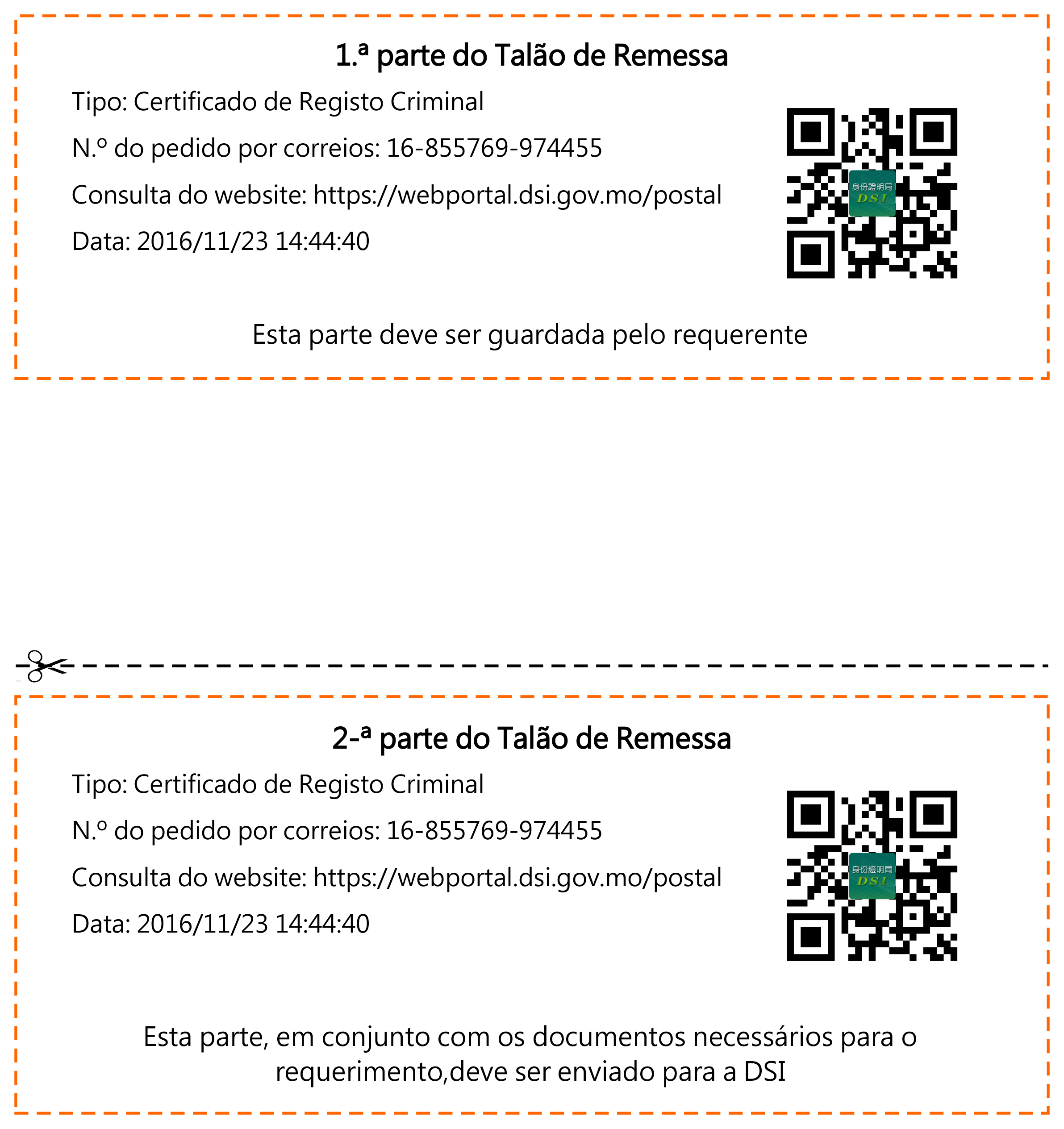 Antes do envio de requerimento, deve ser obtido o talão de remessa de pedido por correios, e para tal, deve entrar na página electrónica da DSI e na coluna “Serviço de pedidos por correios” clique em “Novo pedido” e, de seguida, é solicitado ao usuário que seleccione o tipo de pedido e preencha o email address para obter o talão do pedido que contém o número do pedido e é composta por duas partes: a 1.ª parte fica na guarda do requerente e a 2:ª parte do talão, acompanhado de documentos necessários para a instrução do requerimento, deve ser enviado para a DSI. Recebido o requerimento, a DSI fará a apreciação e a actualização atempada do estado do requerimento no sistema. O requerente poderá acompanhar todo o andamento do seu pedido, desde a recepção de documentos, notificação da apresentação de elementos em falta, notificação de pagamento até à emissão de certificado ou documento de viagem, através do website da DSI, basta aceder ao sistema e dê um clique em “Consultar o estado de pedido” e depois preencher o número do pedido indicado no talão e o email address, economizando assim o tempo para solicitar informações pelo telefone ou por email. Depois de o requerente ter recebido a notificação de pagamento e efectuado o pagamento on-line das devidas taxas de emissão e serviço de remessa por meio de cartão de crédito, a DSI fará a produção do documento ou certificado requerido que será enviado para o requerente na data prevista de entrega.