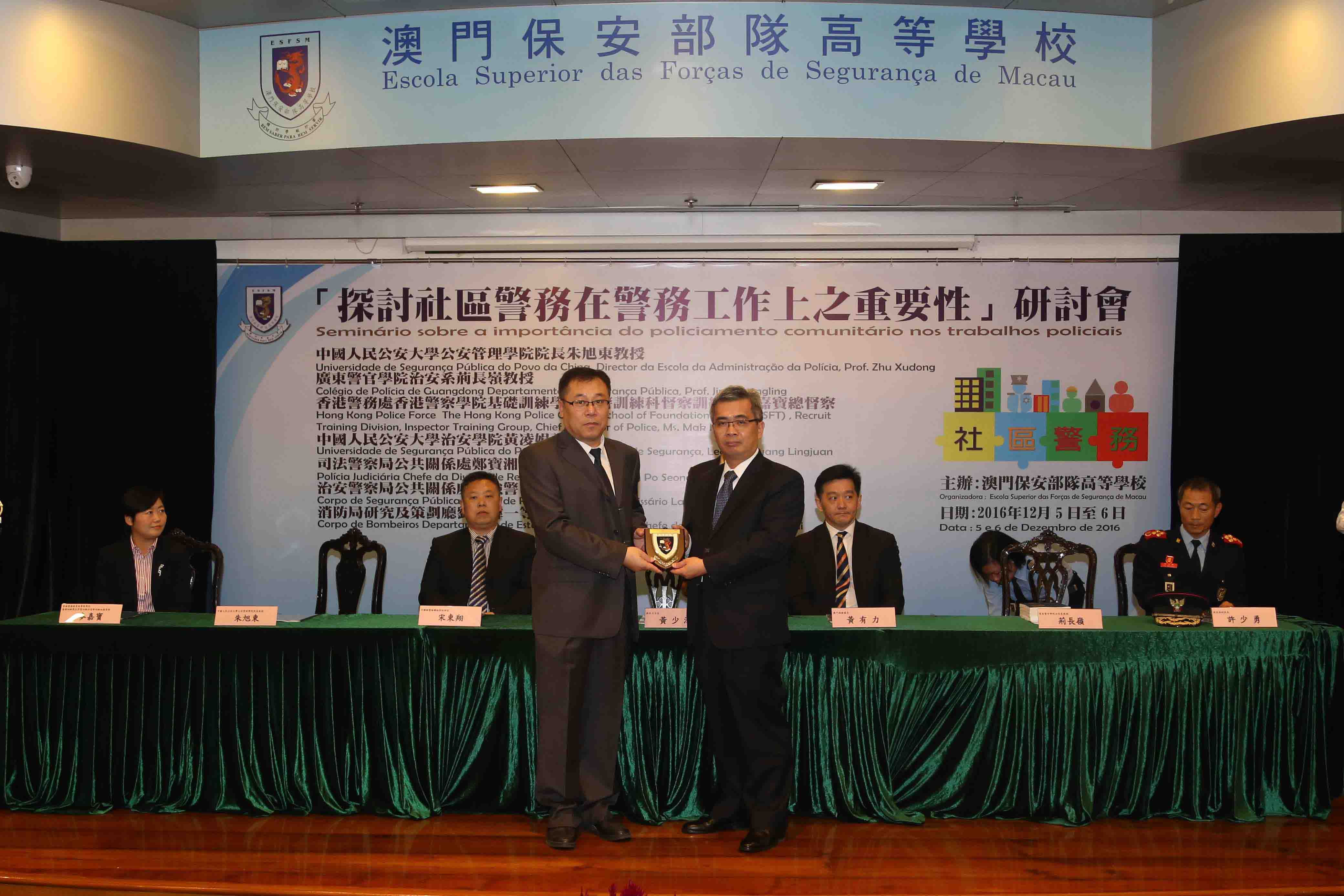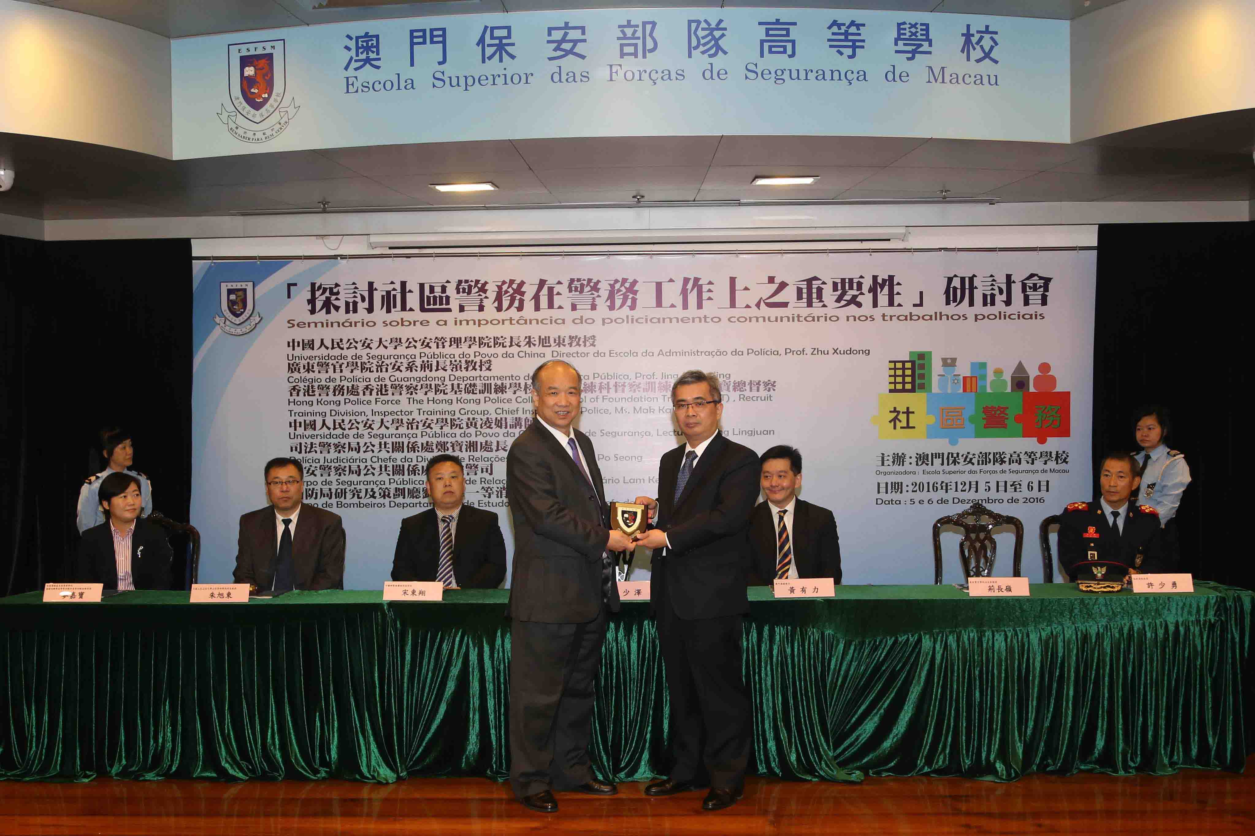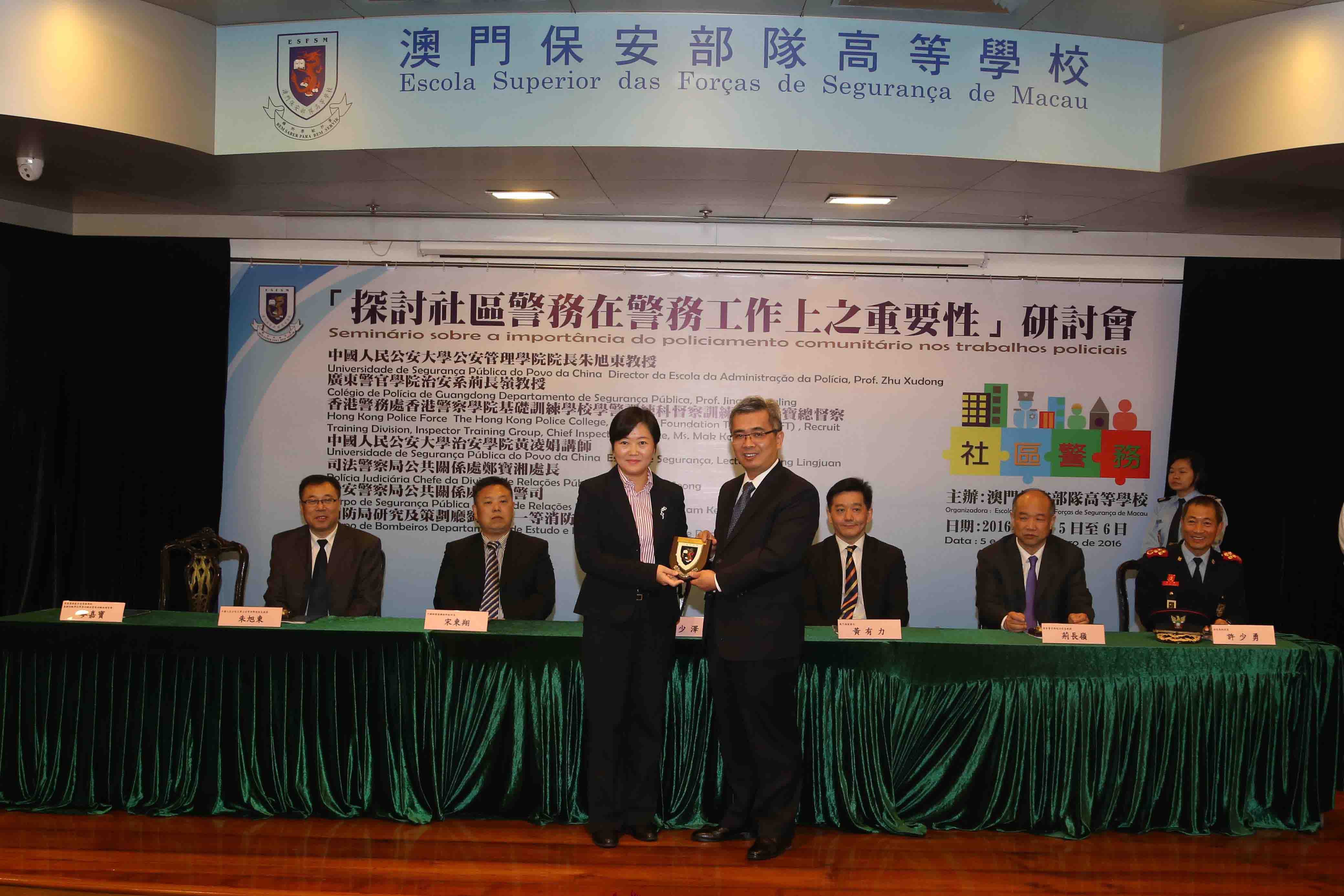 O seminário foi realizado em dois dias, no primeiro dia, o Prof. Zhu Xudong, Director da Escola da Administração da Polícia da Universidade de Segurança Pública do Povo da China, Ms. Mak Ka Po, The Hong Kong Police College, School of Foundation Training (SFT) , Recruit Training Division, Inspector Training Group, Chief Inspector of Police of Hong Kong Police Force, o Prof. Jing Changling, Departamento de Segurança Pública do Colégio de Polícia de Guangdong, Cheang Pou Seong, Chefe da Divisão de Relações Públicas da Polícia Judiciária, proferiram respectivamente os seguintes temas: “Estudo inovador do policiamento comunitário chinês sob ponto de vista de administração de sociedade”, “Importância do policiamento comunitário nos trabalhos policiais de Hong Kong”, “Actualidade e desenvolvimento futuro do policiamento comunitário de Guangdong”, “A importância do policiamento comunitário nos trabalhos policiais”. No segundo dia, a Lecture Huang Lingjuan, Escola de Segurança da Universidade de Segurança Pública do Povo da China, o Comissário Lam Keong, Divisão de Relações Públicas do Corpo de Segurança Pública, o Chefe de Primeira Lao Hou Wai, Departamento de Estudo e Planeamento do Corpo de Bombeiros, proferiram respectivamente os seguintes temas: “A Posição e função do policiamento comunitário nos modernos trabalhos policiais”, “Desenvolvimento e prática do policiamento comunitário do CPSP”, “Importância do policiamento comunitário nos trabalhos de bombeiros”. Através de abordagem em conjunto e troca de conhecimentos teóricos e experiências práticas no policiamento comunitário entre três lugares, pretende-se que os agentes policiais se reforçem por entender a importância de "policiamento comunitário" no trabalhos policiais, de modo que os trabalhos policiais produzam maiores efeitos na comunidade.