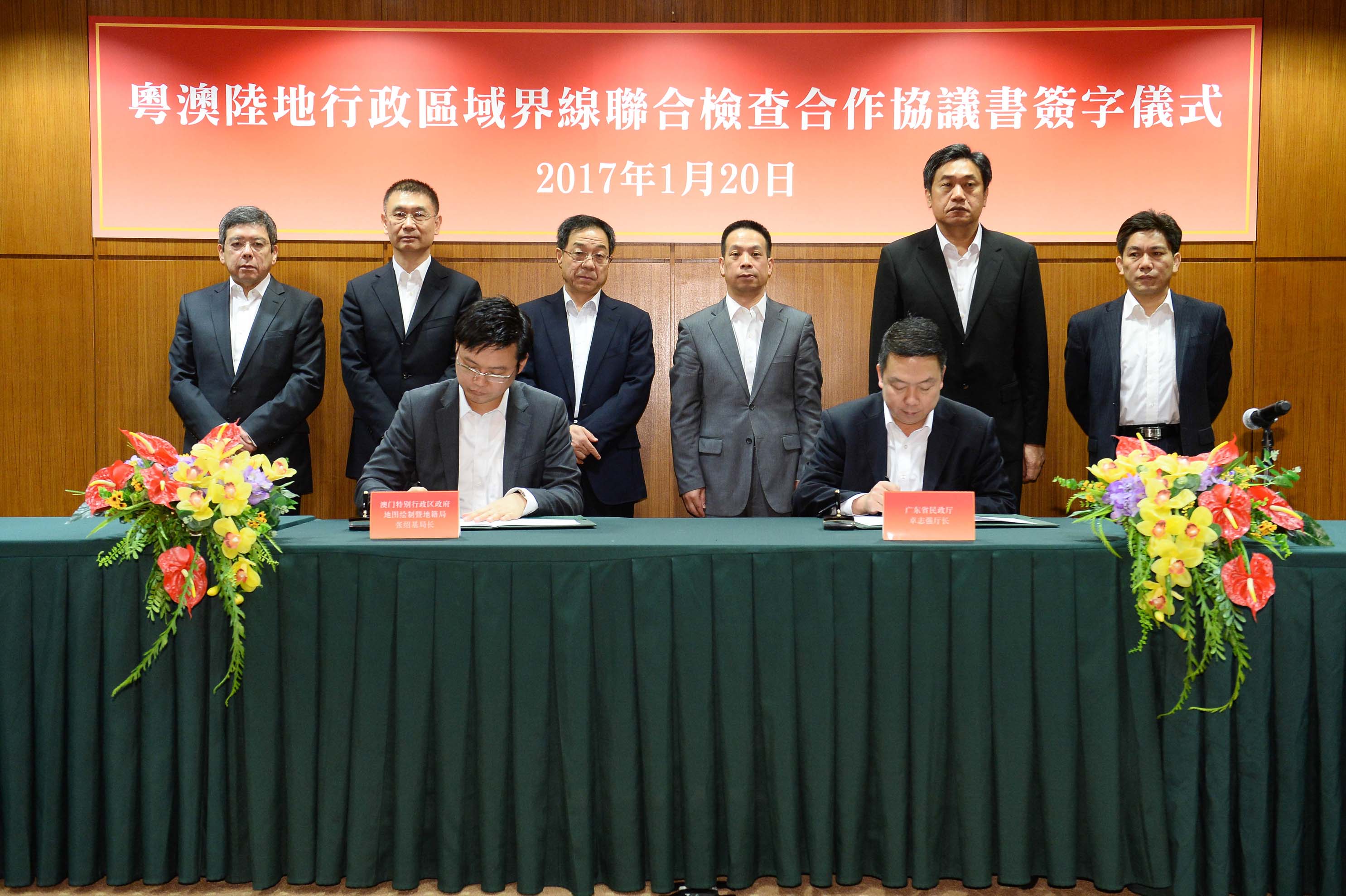 De acordo com a promulgação do Decreto do Conselho do Estado da República Popular da China n.° 665, no dia 20 de Dezembro do ano 2015, foi publicado o “Mapa da Divisão Administrativa da Região Administrativa Especial de Macau da República Popular da China” que definiu a delimitação da área de gestão marítima e terrestre da RAEM, o que providencia melhores condições para o desenvolvimento sustentável da sociedade e economia da RAEM. No intuito de reforçar a administração da delimitação terrestre entre Guangdong e RAEM, promover a cooperação e desenvolvimento mútuo entre Guangdong e RAEM, aos 20 de Janeiro de 2017, no Posto Fronteiriço das Portas do Cerco, Guangdong e RAEM conjuntamente, realizou a cerimónia da assinatura do “Acordo de Inspecção Conjunta da Delimitação da Divisão Administrativa entre a Província de Guangdong e a Região Administrativa Especial de Macau”, e no marco n.o2 da delimitação terrestre realizou a cerimónia do estabelecimento de marcos na delimitação terrestre entre Guangdong e RAEM, e seguidamente realizaram a inspecção in loco sobre os trabalhos do estabelecimento de marcos na delimitação terrestre entre Guangdong e RAEM.